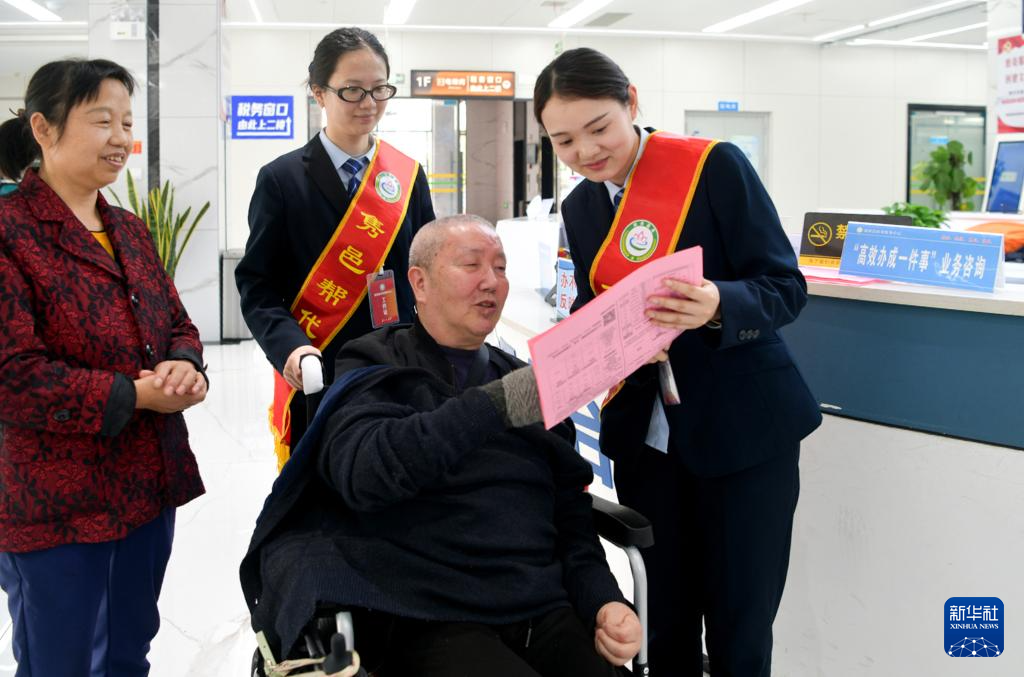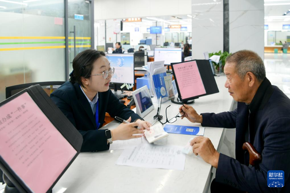 4月10日,在湖北省咸宁市通城县政务服务中心“高效办成一件事”窗口,工作人员为村民办理业务。新华社发(刘建平摄)
