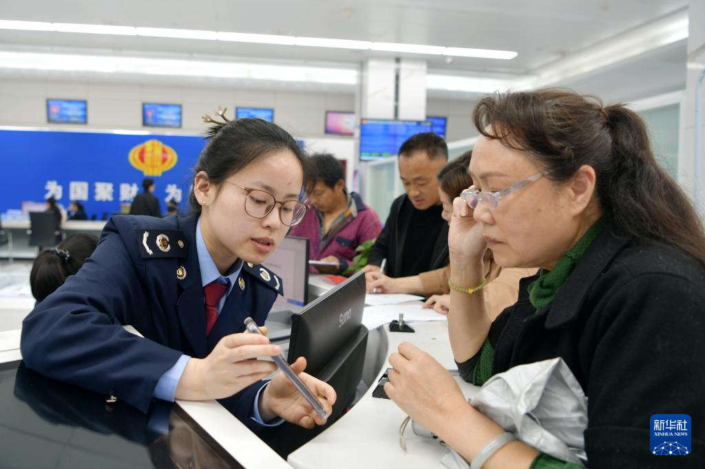 4月8日,在湖北省咸宁市通城县政务服务中心,工作人员指导市民手机办理纳税业务。新华社发(刘建平摄)