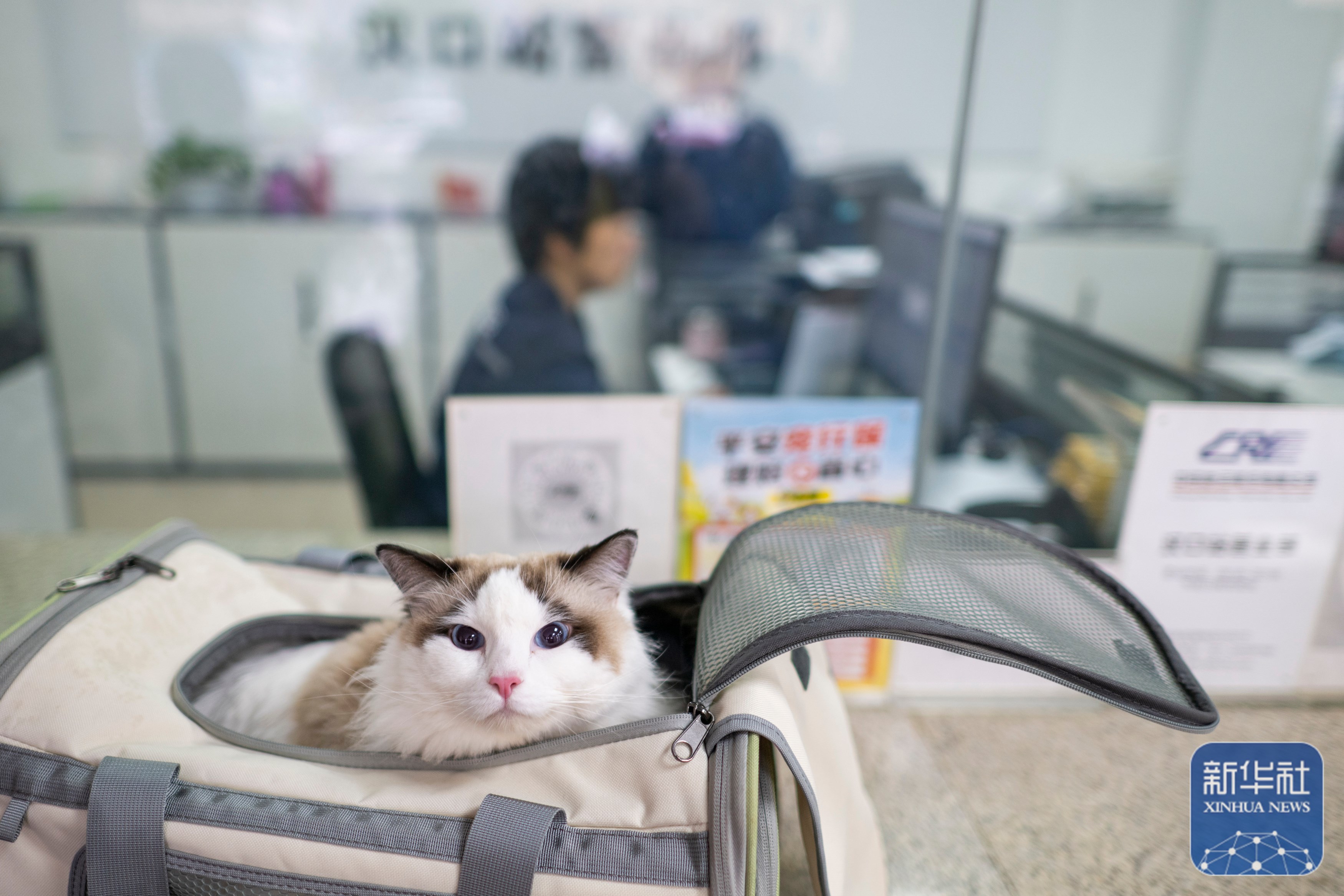 ↑ 4月11日,在湖北省武汉市汉口站,一只宠物猫等待办理宠物承运手续。