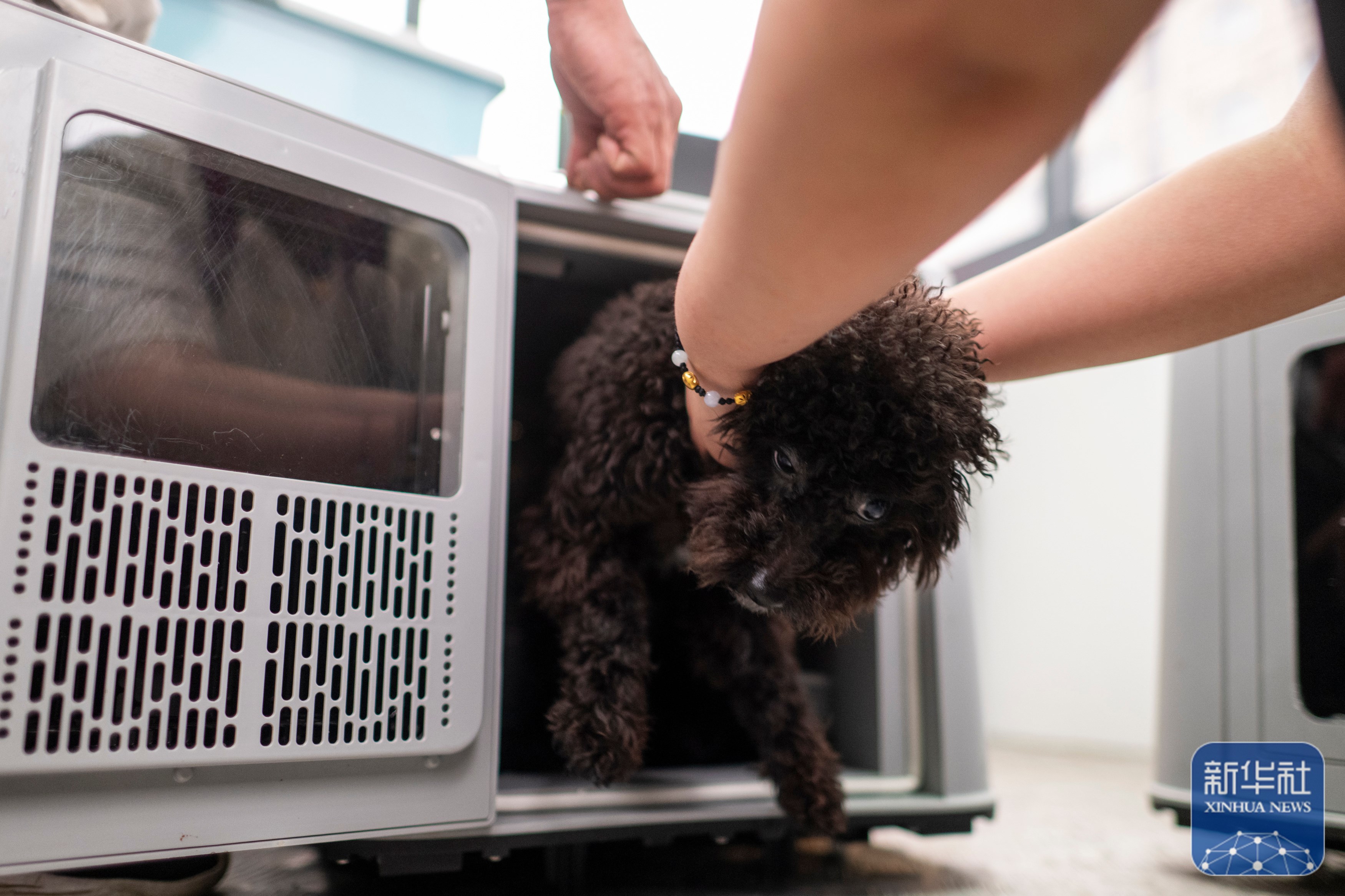 ↑ 4月11日,在湖北省武汉市汉口站,旅客把宠物狗放进专用宠物运输箱内。