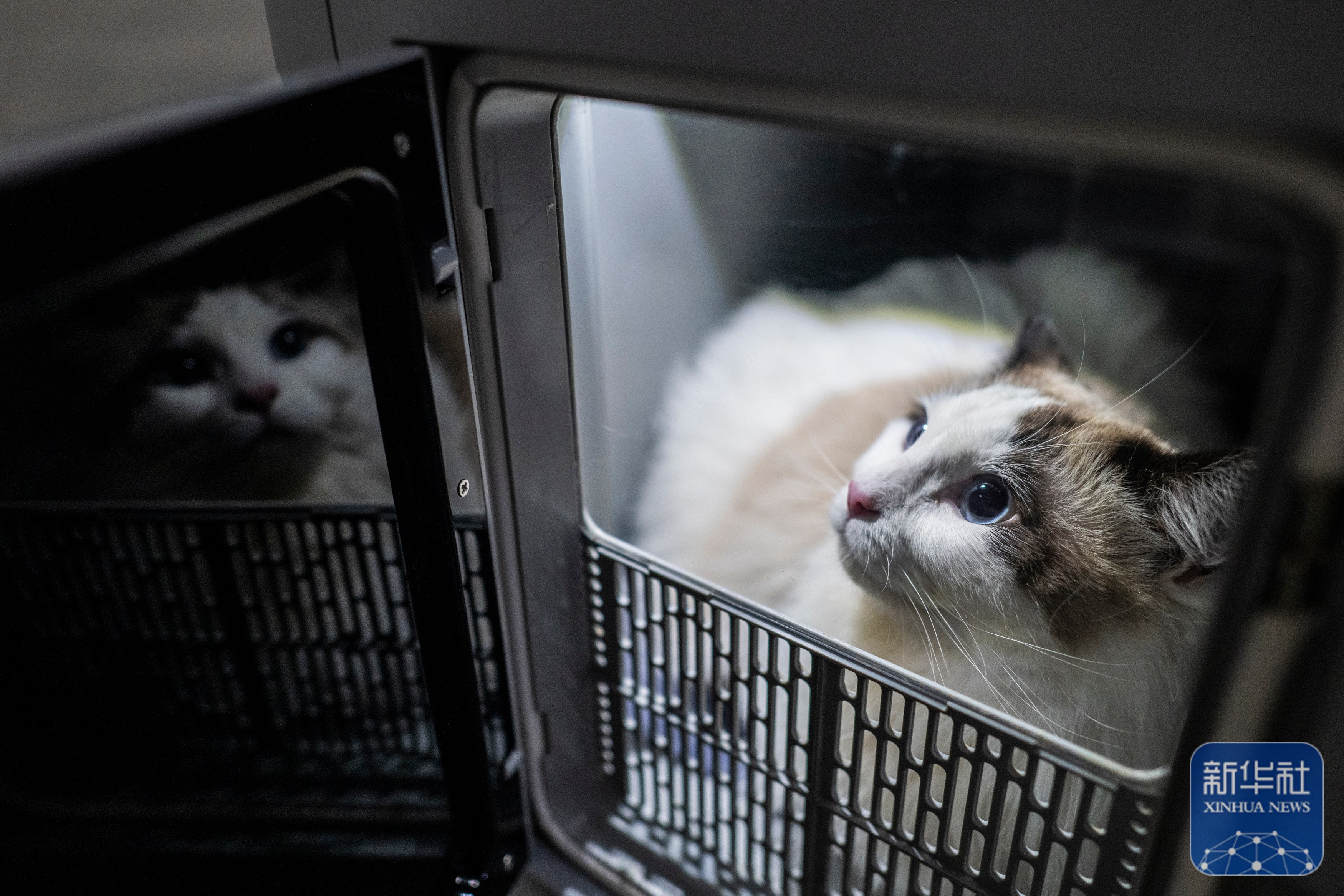 ↑ 4月11日在湖北省武汉市汉口站拍摄的专用宠物运输箱内的宠物猫。