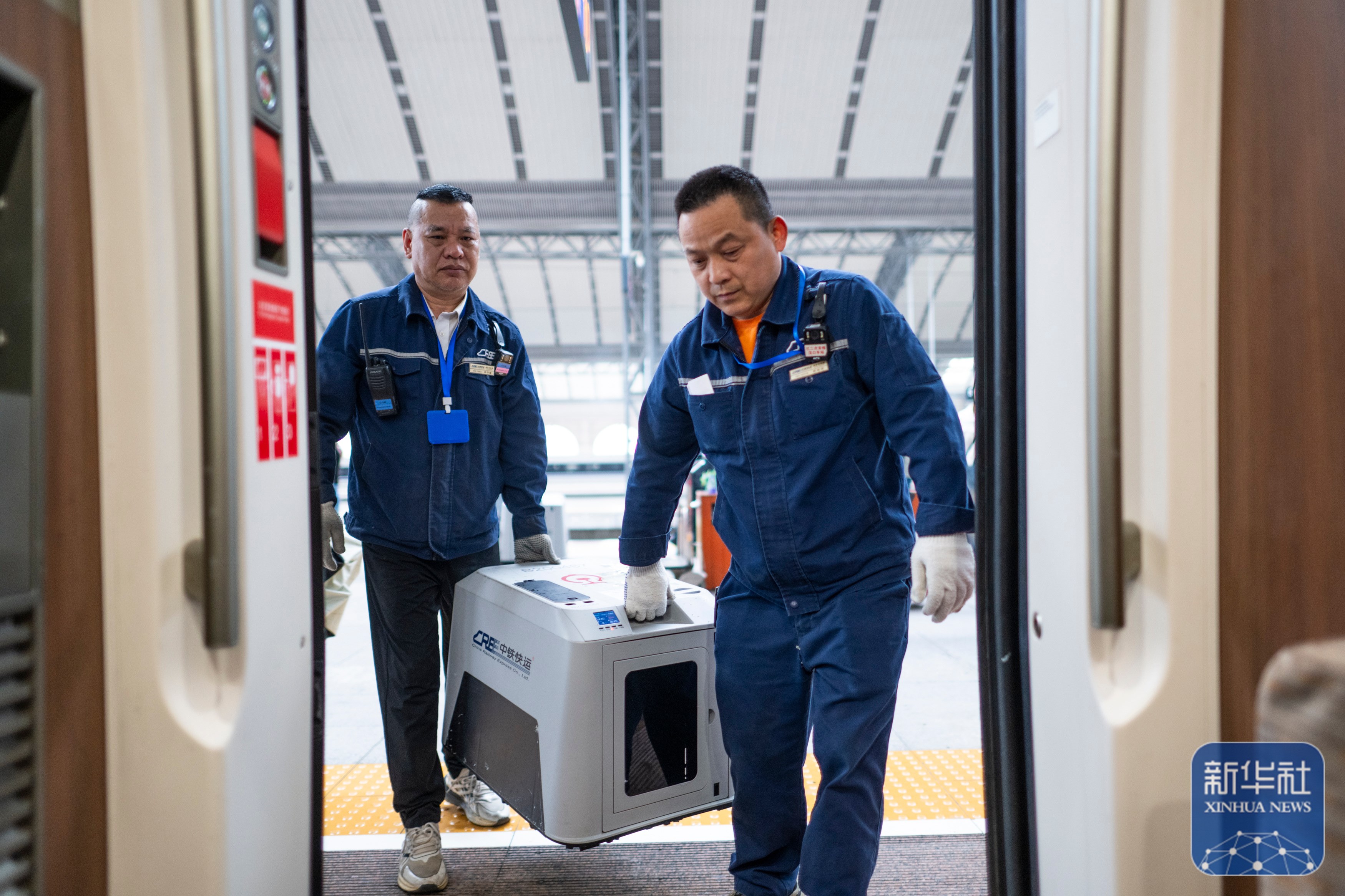 ↑ 4月11日,在湖北省武汉市汉口站,工作人员将宠物托运箱转运至高铁车厢。