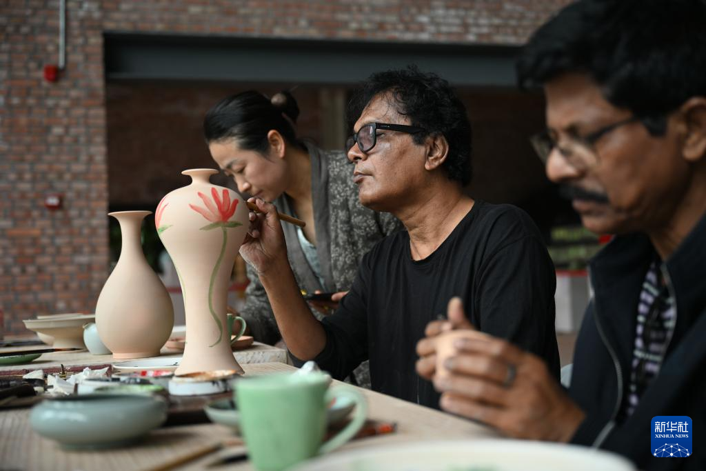 在龙泉市望瓯·陶溪川文创街区,中孟两国艺术家比邻而坐,在青瓷坯体上勾勒纹样、相互交流。孟加拉国典范事务所首席建筑师、画家曼苏尔·马哈茂德·马克苏德说,对艺术创作而言,面对面的交流碰撞非常重要。希望未来两国艺术从业者常来常往,让文明交流互鉴,让友谊长存。