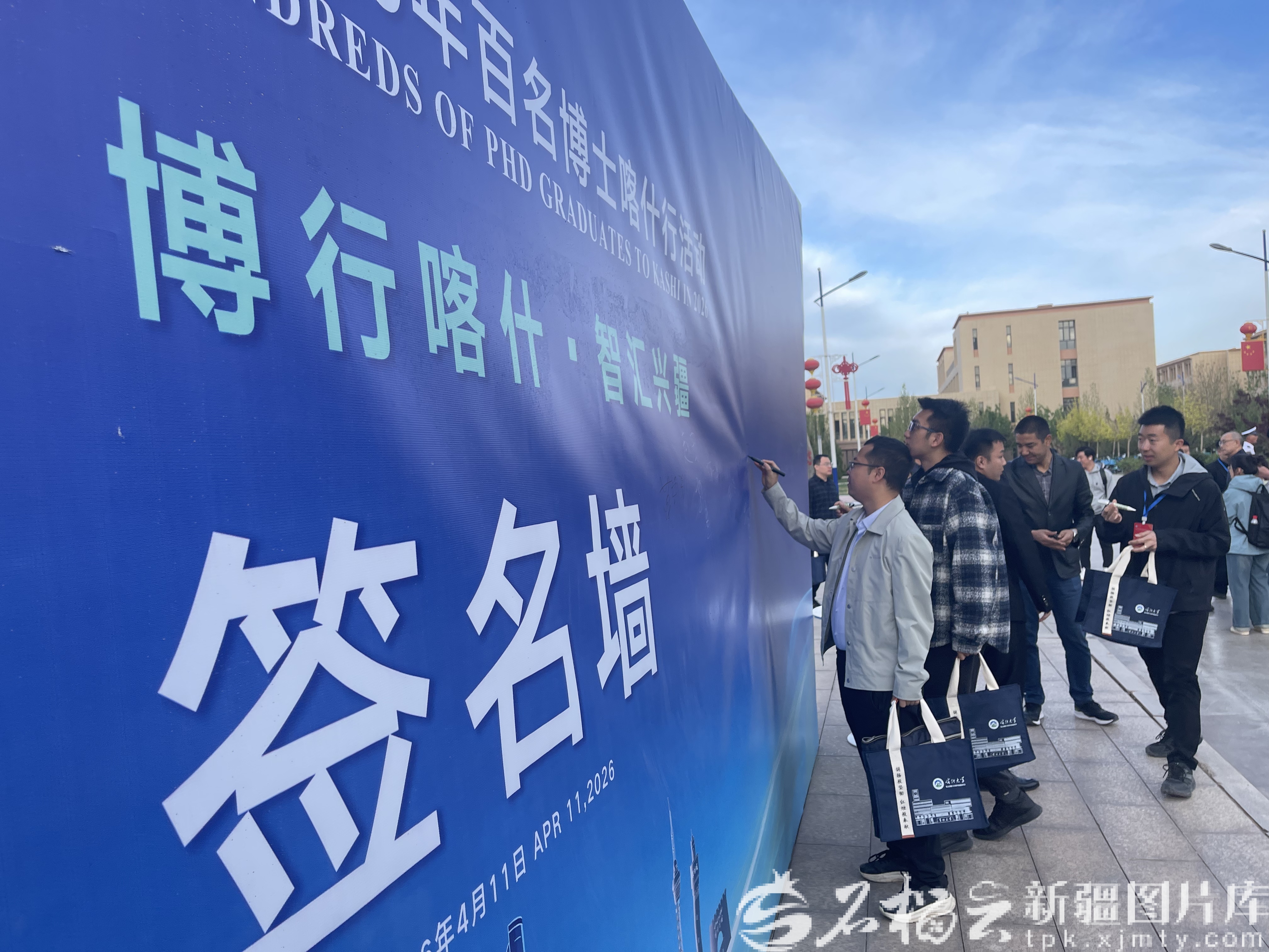4月11日,喀什大学2026年春季“百名博士喀什行”活动中,青年博士在签名墙签字留念。石榴云/新疆日报记者 赵西娅摄