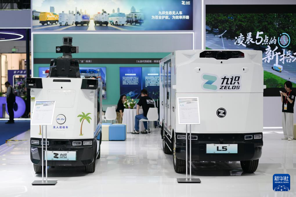 4月14日在第六届消博会科技消费展区拍摄的使用AI技术工作的九识无人车产品。新华社记者 辛悦卫 摄