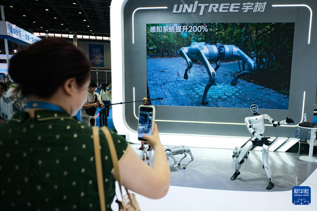 4月14日,观众在第六届消博会展厅内拍摄跳舞表演的宇树机器人。新华社记者 辛悦卫 摄
