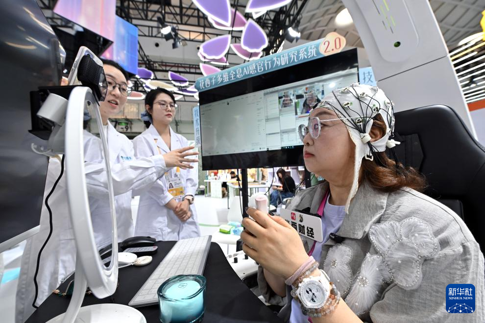 4月14日,展商在消博会现场展示美妆多维全息AI感官行为研究系统。新华社记者 郭程 摄
