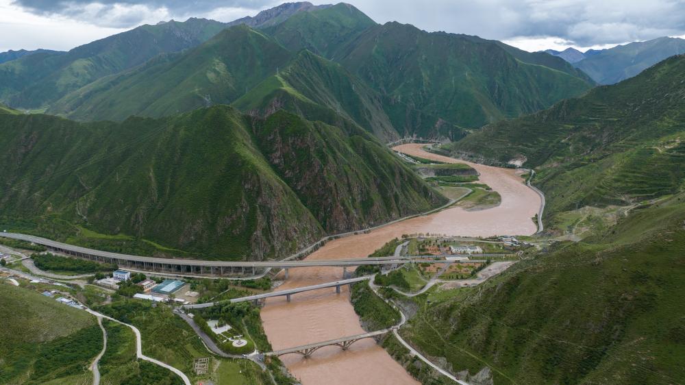 无人机正在扎曲附近测量河道周边地形。新华社发