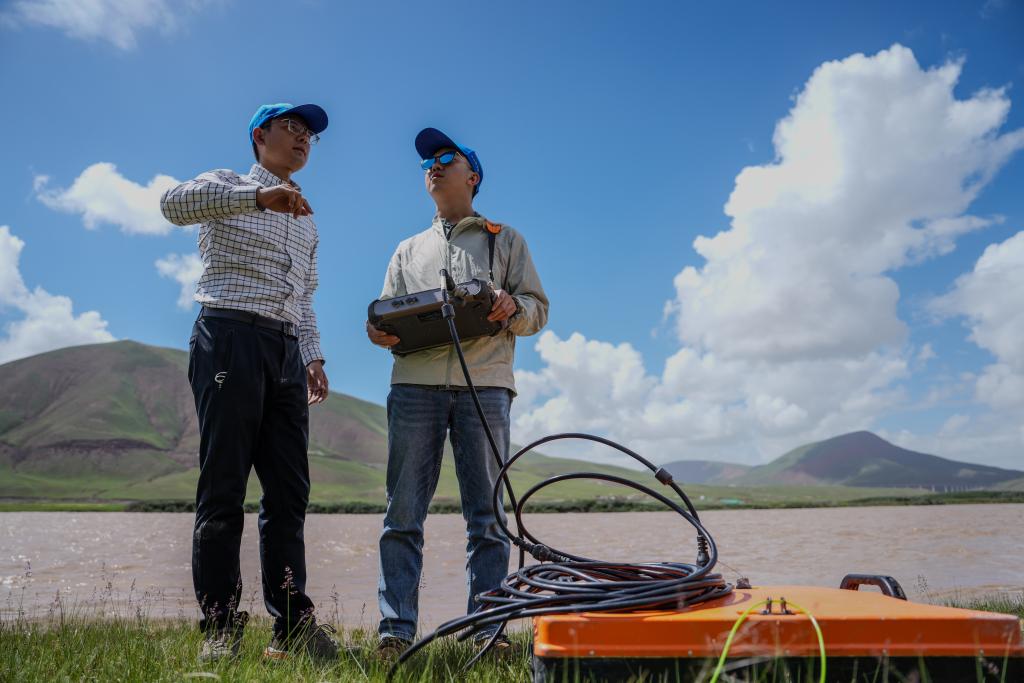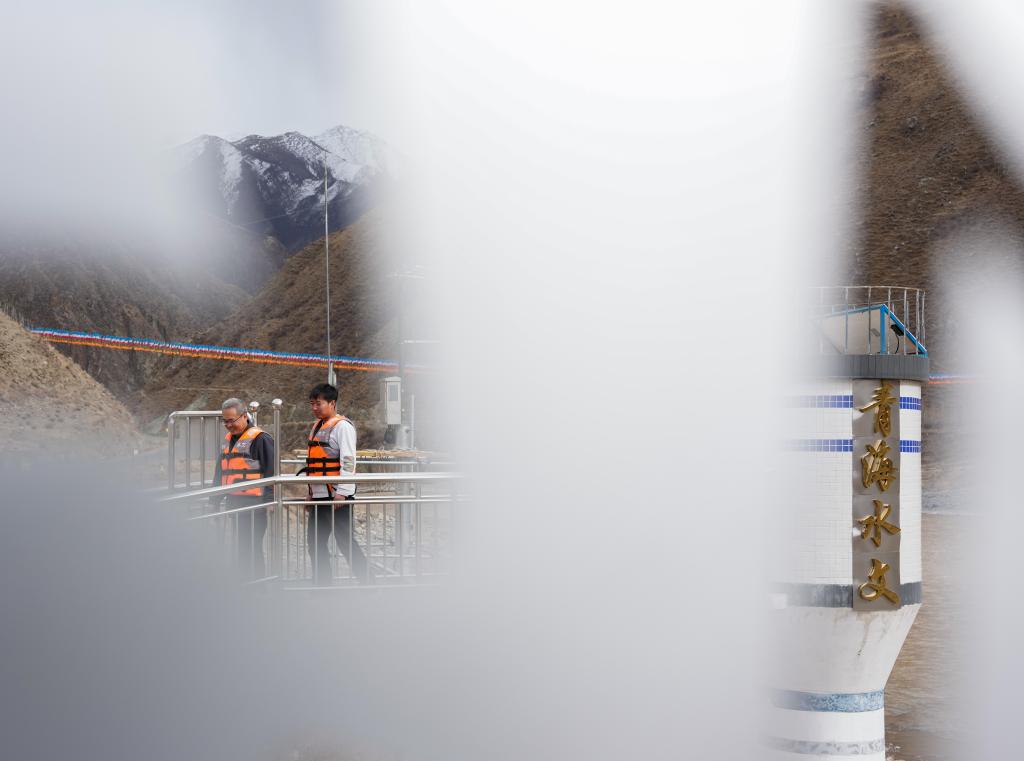 青海省水文水资源测报中心职工在子曲附近观察地形。新华社发