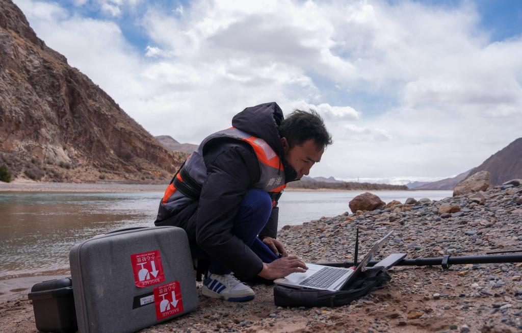 青海省玉树水文水资源测报分中心职工在隆宝滩水文站附近测量。新华社发