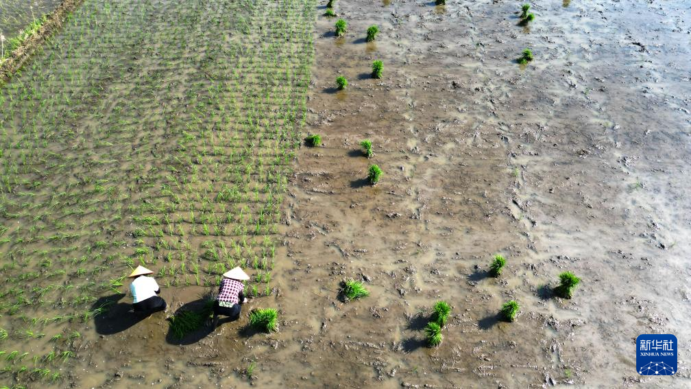 4月25日,在江西省九江市都昌县土塘镇潭湖村,农民在田间栽插早稻。新华社发(傅建斌摄)
