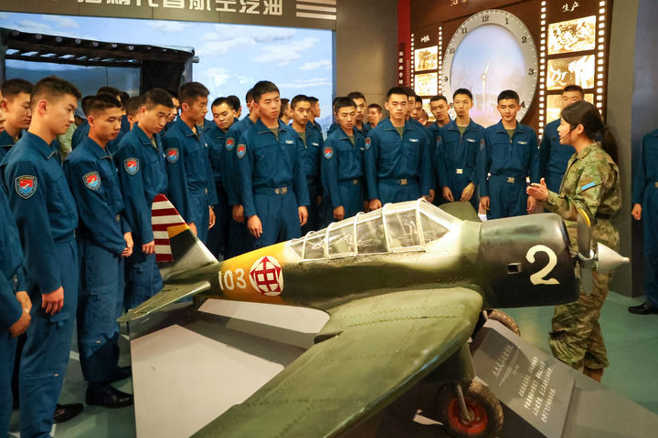 同样的场景,也在哈尔滨上演着。在空军哈尔滨飞行学院的院史馆里,一群年轻的飞行学员正在参观。他们穿着现代的飞行服,看那些泛黄的照片、生锈的零件、破旧的笔记。