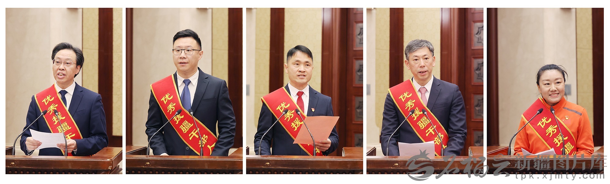 4月27日,在表彰会上,博尔塔拉蒙古自治州党委副书记方向荣、和田地区墨玉县委副书记康家铭、新疆理工学院食品科学与工程学院副院长李佳、喀什地区第二人民医院院长陈尉华、阿勒泰地区文化体育广播电视和旅游局体育科副科长张秋爽(从左至右)代表援疆干部人才发言。石榴云/新疆日报记者 崔志坚摄