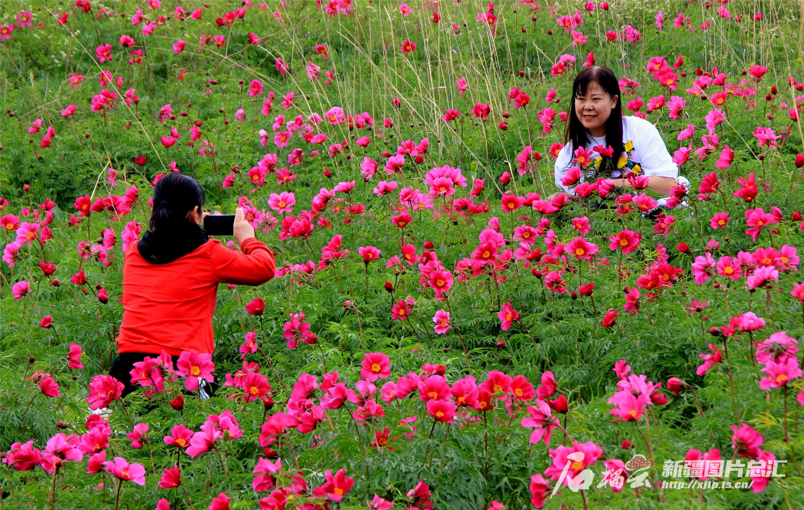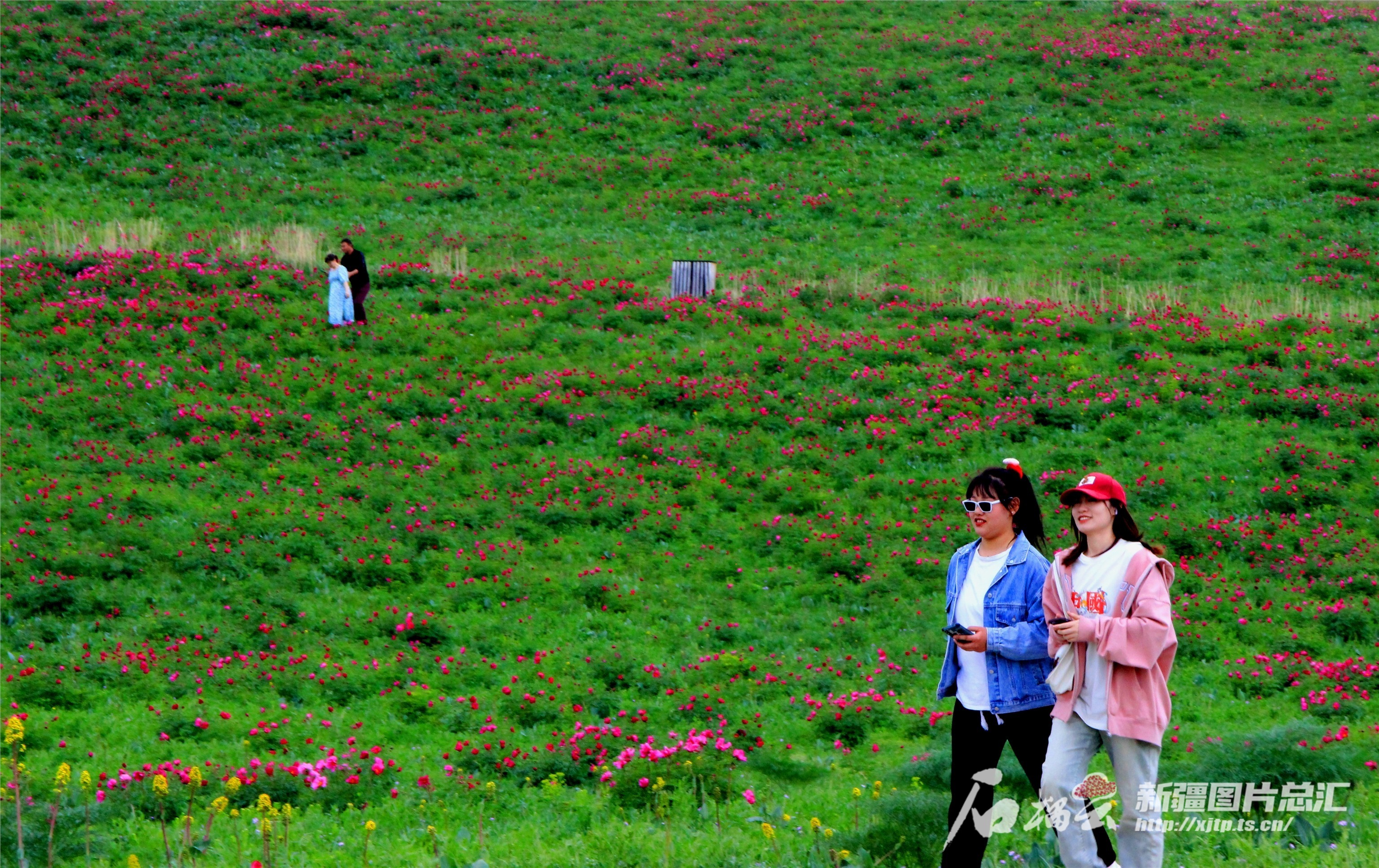 5月8日,游客在山花烂漫的裕民县巴尔鲁克山风景区野生芍药谷拍照留影。杨化光摄