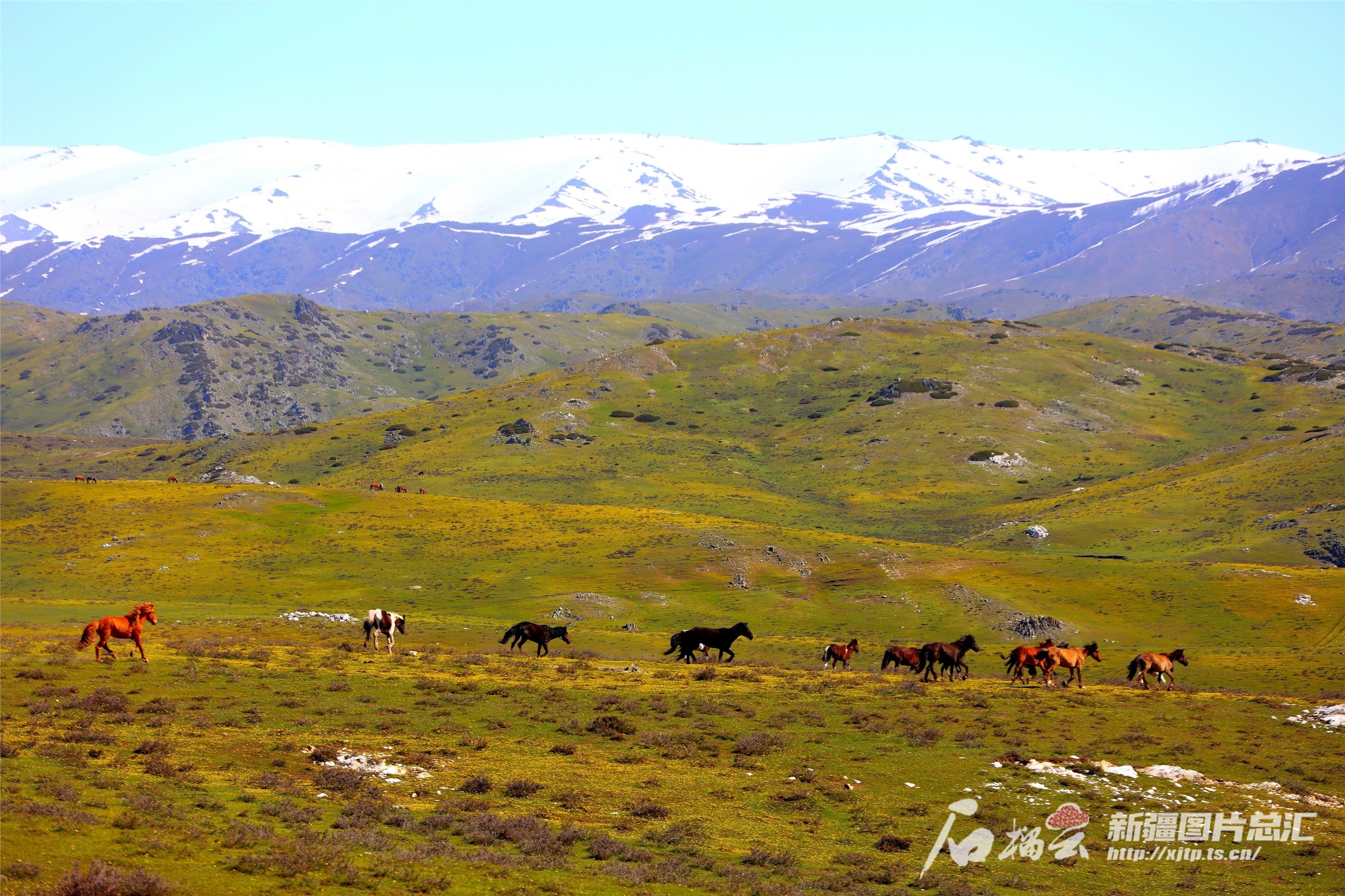 5月5日,一群马正在阿勒泰市拜格托别村草原上觅食、奔跑。刘是何摄