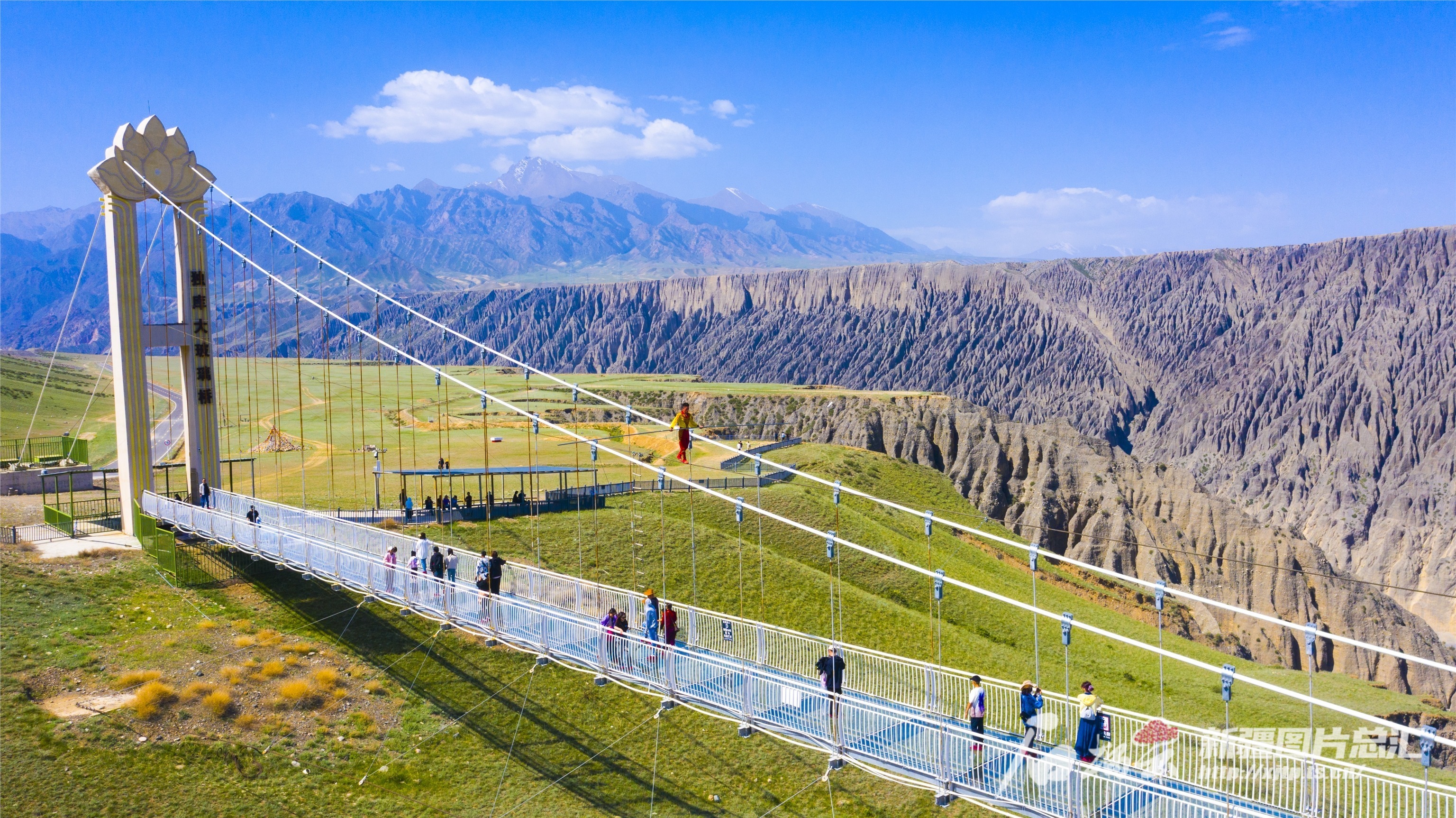 5月5日,在独山子大峡谷,游客在玻璃桥观赏达瓦孜高空走钢丝表演。李华北摄