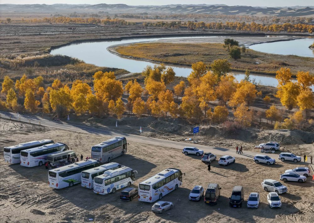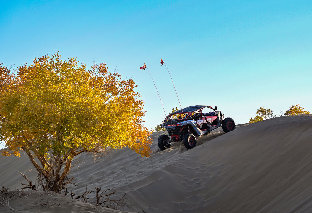 游客乘坐沙漠越野车在葫芦岛景区内观赏胡杨(10月26日摄)。 新华社记者 陈朔 摄
