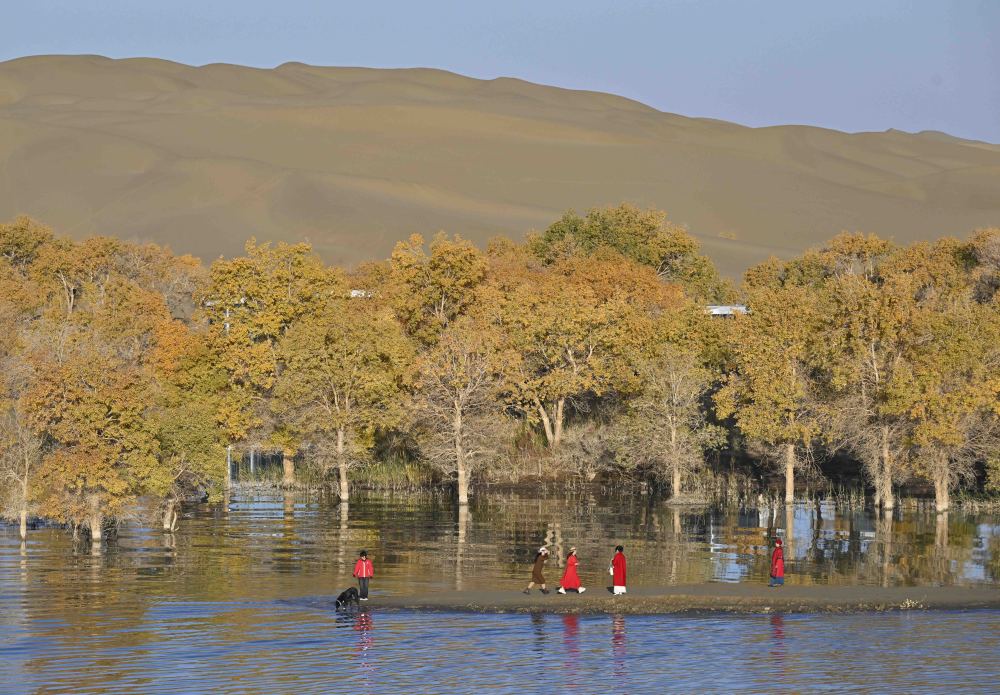 游客在葫芦岛景区内沙山上拍摄胡杨(10月25日摄)。 新华社记者 陈朔 摄