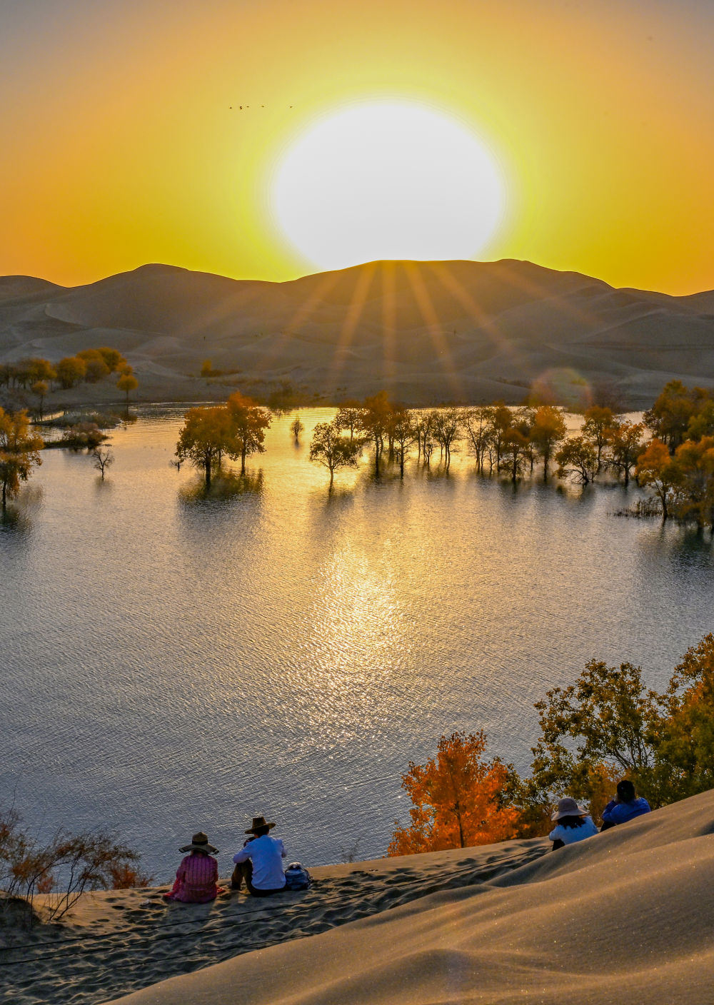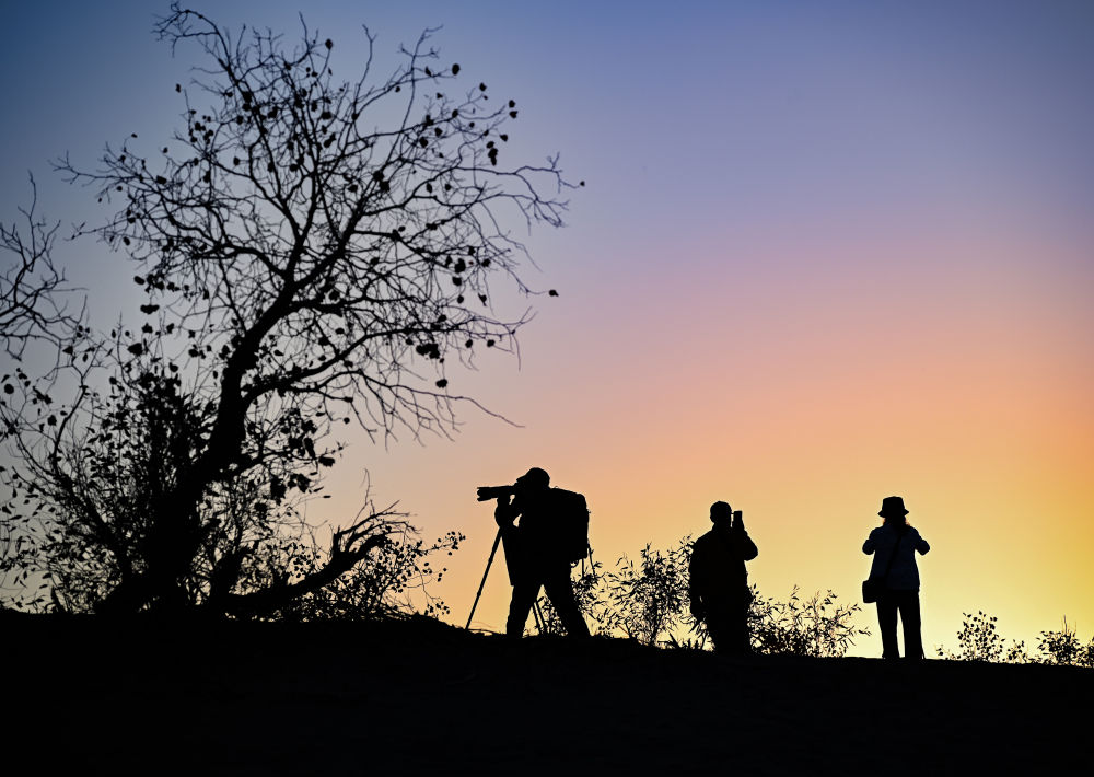 游客在葫芦岛景区内沙山上观赏落日中的胡杨(10月25日摄)。 新华社记者 陈朔 摄