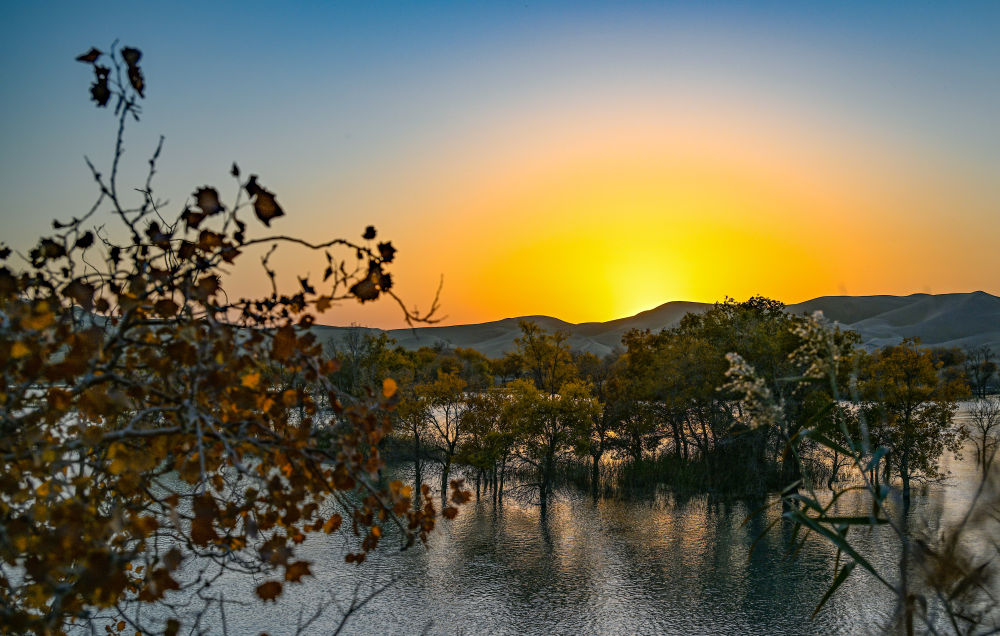 这是葫芦岛景区内落日中的胡杨林和沙山(10月25日摄)。 新华社记者 陈朔 摄