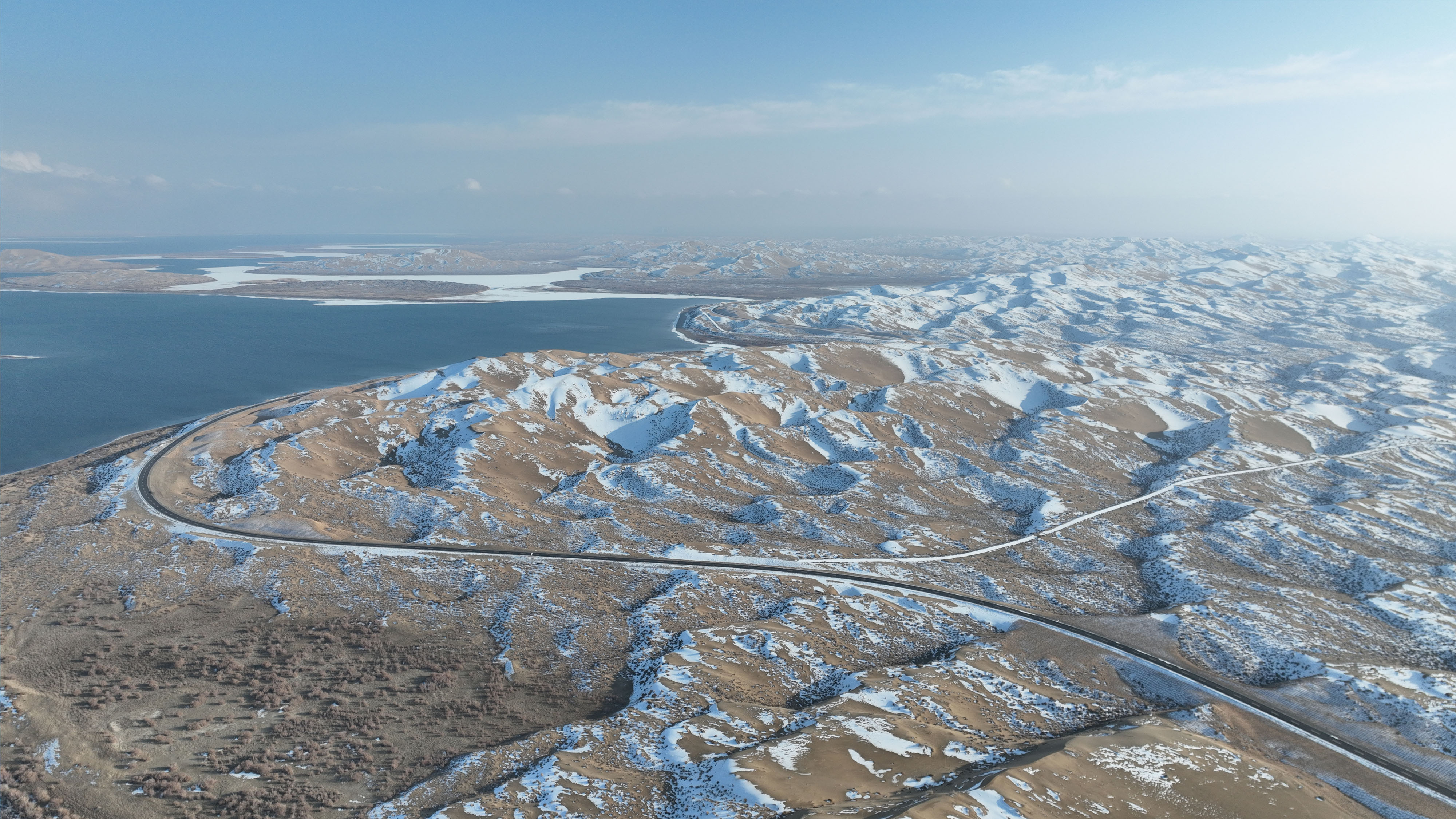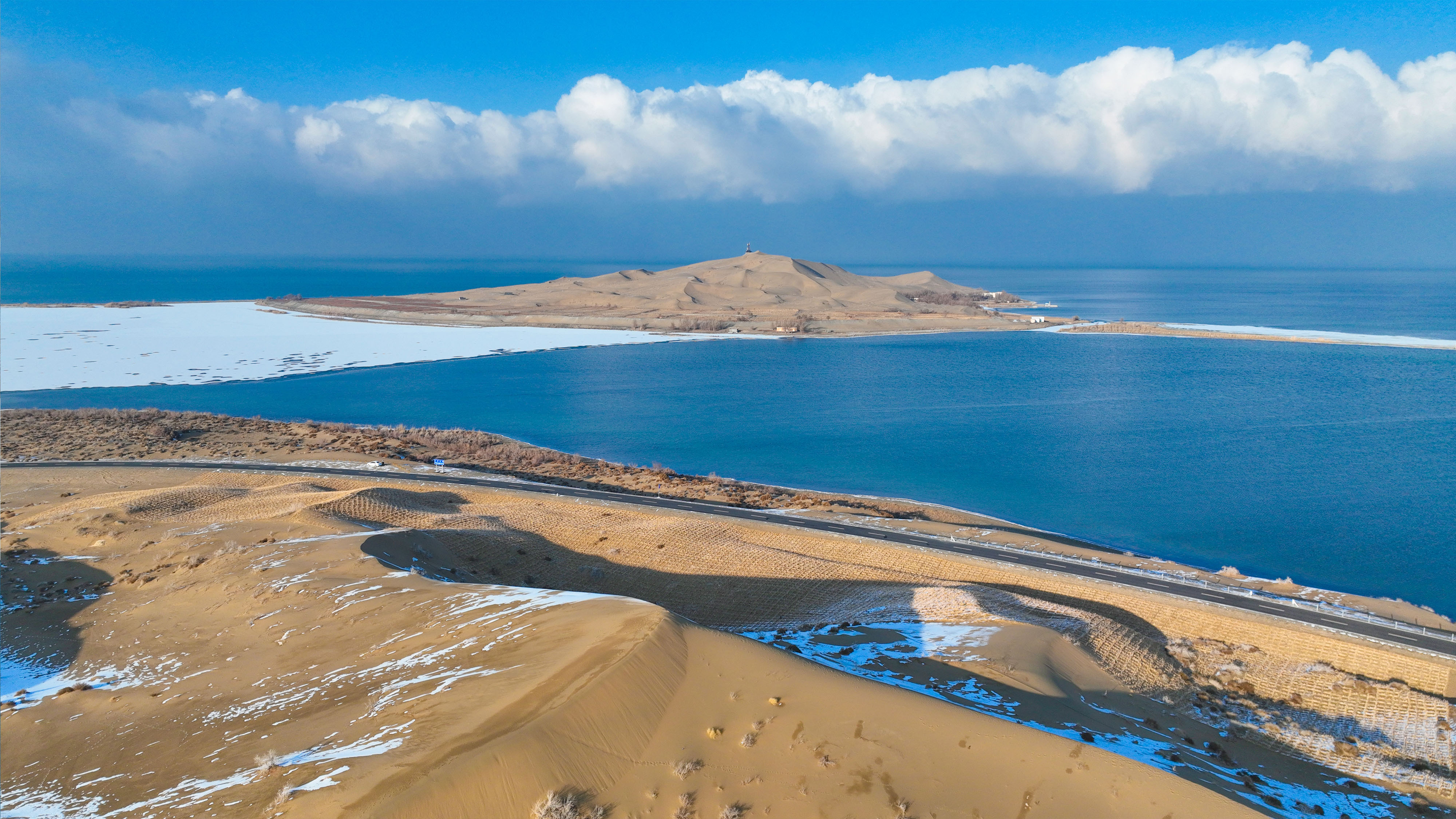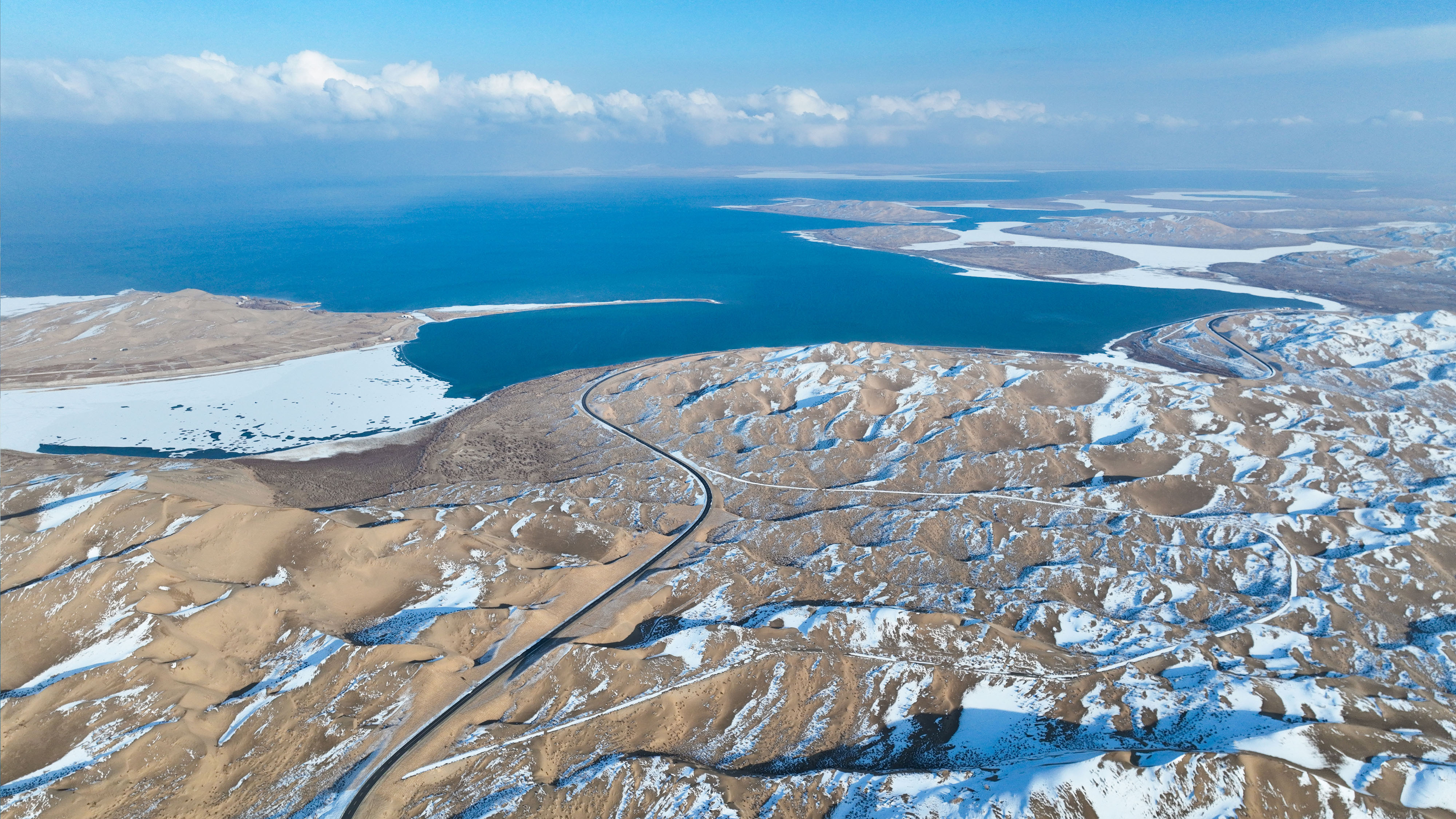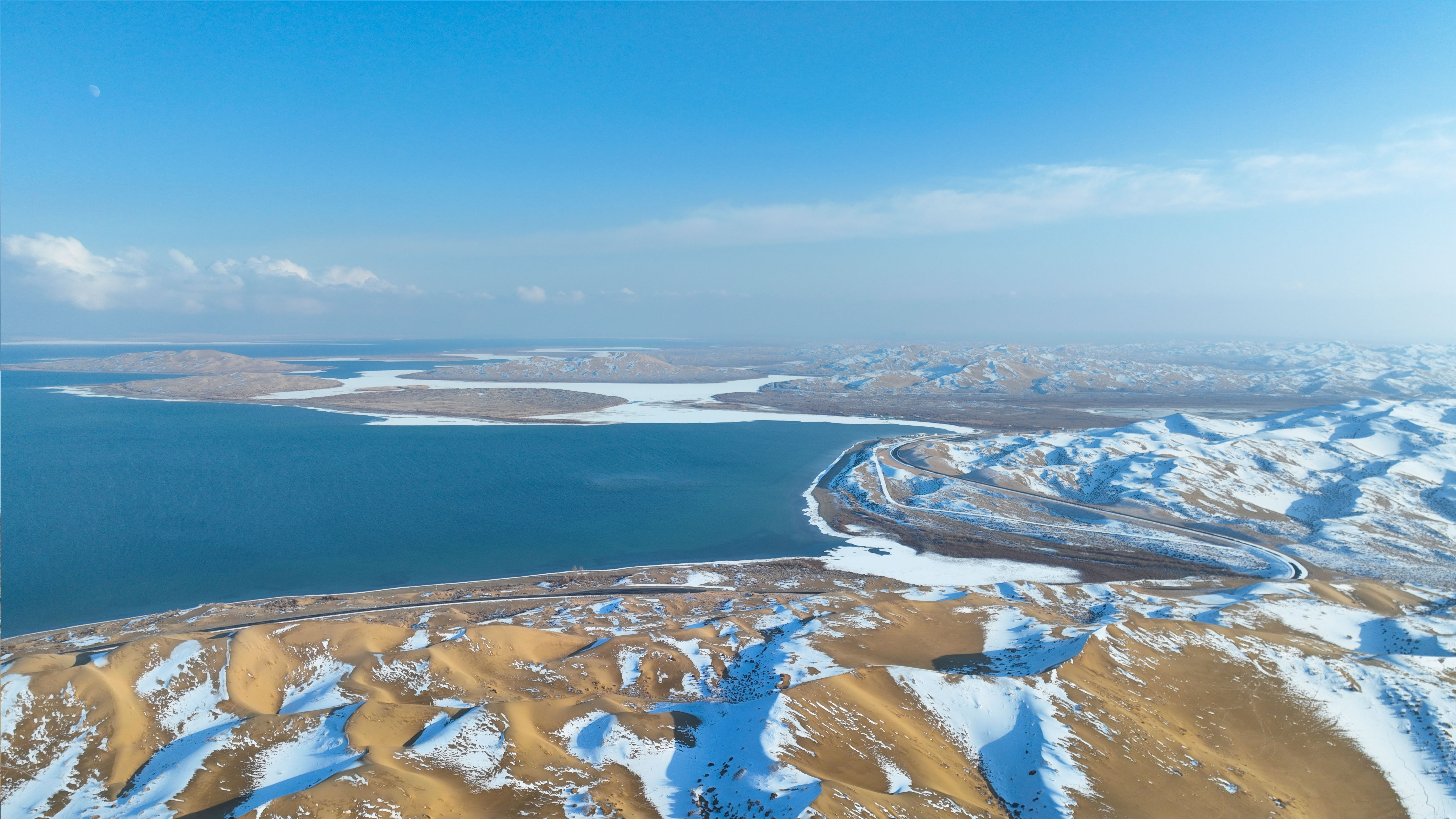 12月11日,雪后初晴,新疆博斯腾湖南岸的沙漠阳光洒落,雪覆沙丘闪耀着耀眼的光芒,天空、湖泊以及沙漠公路共同绘就了一幅冬日的壮丽画卷。
