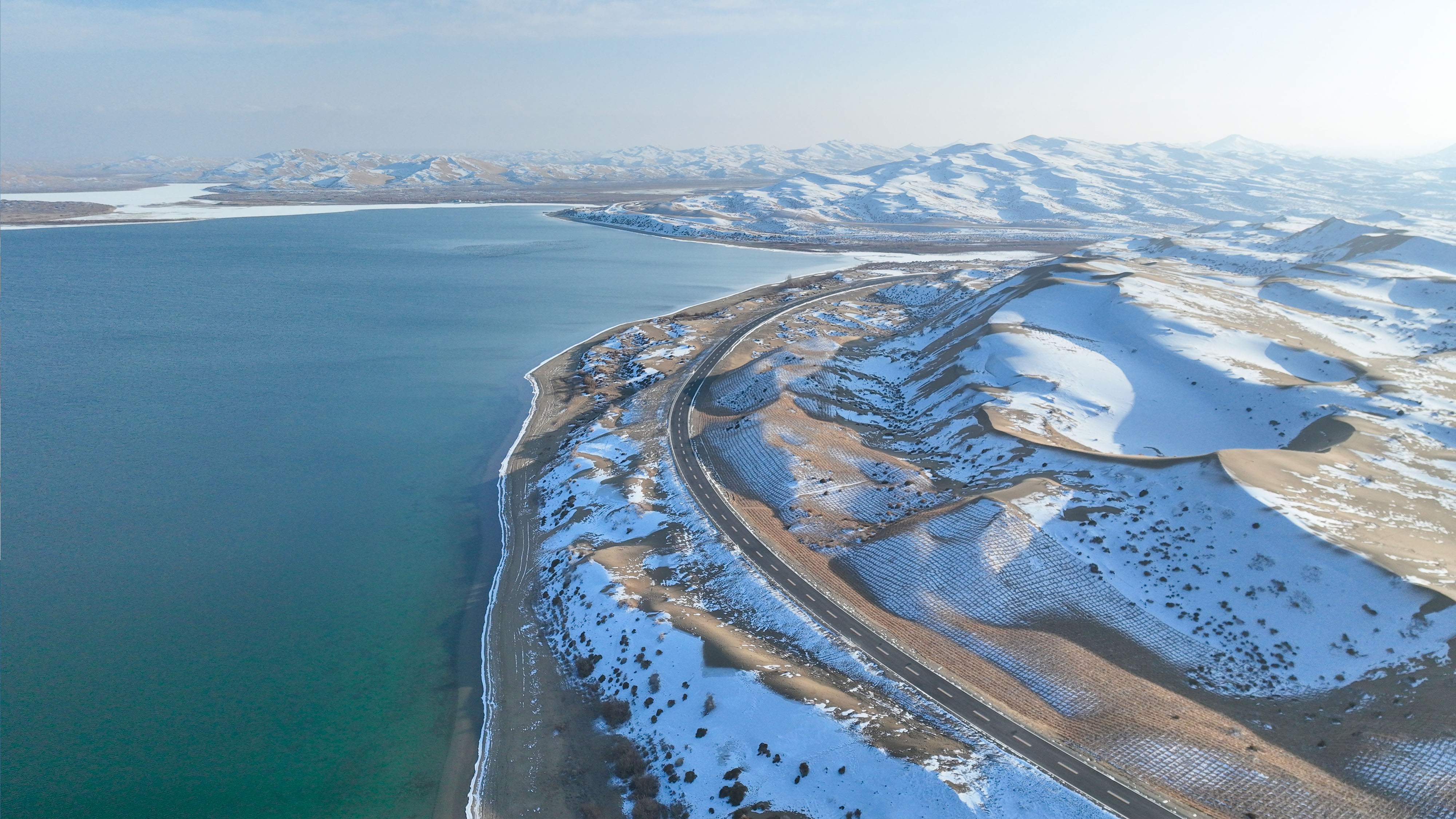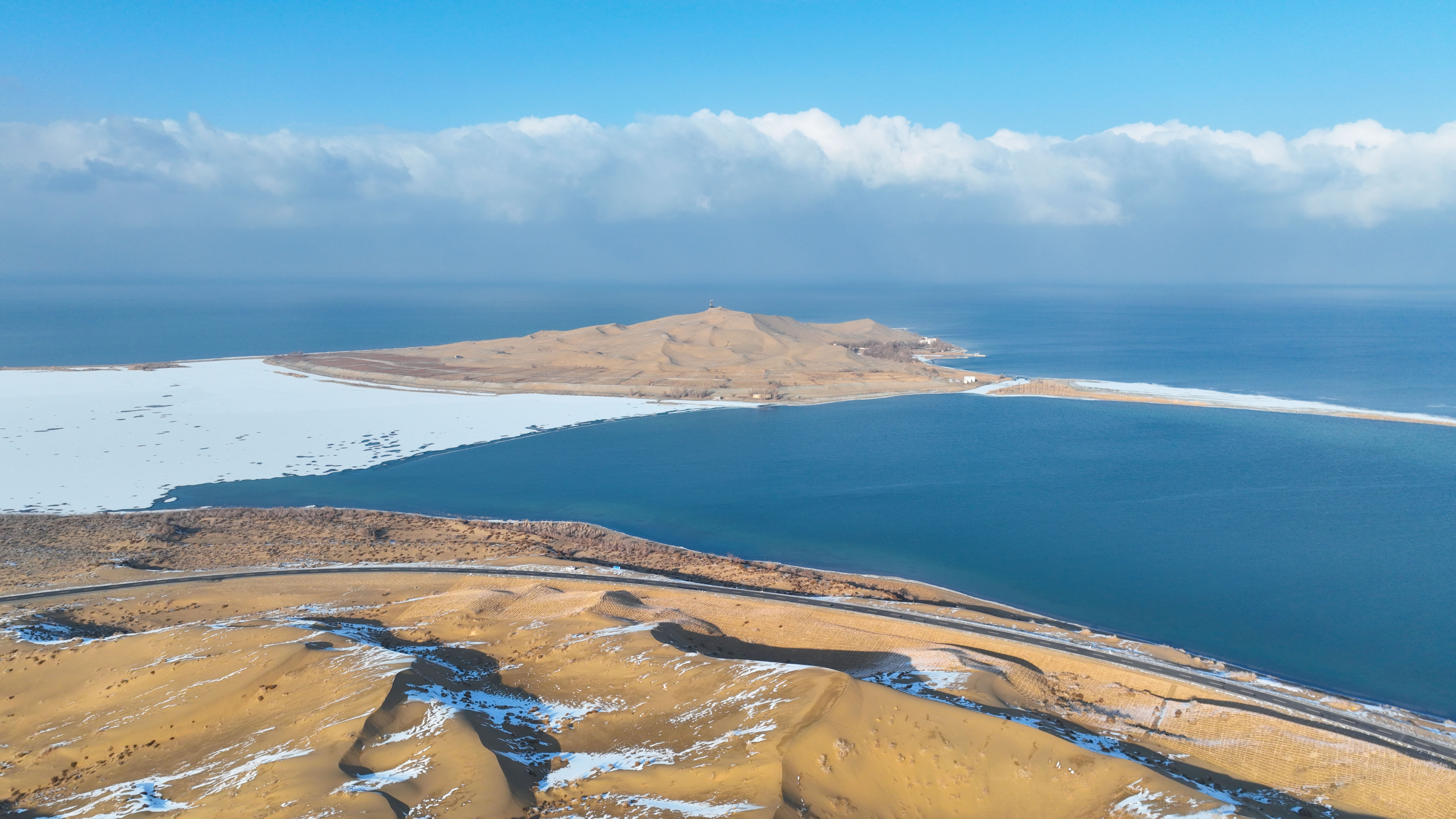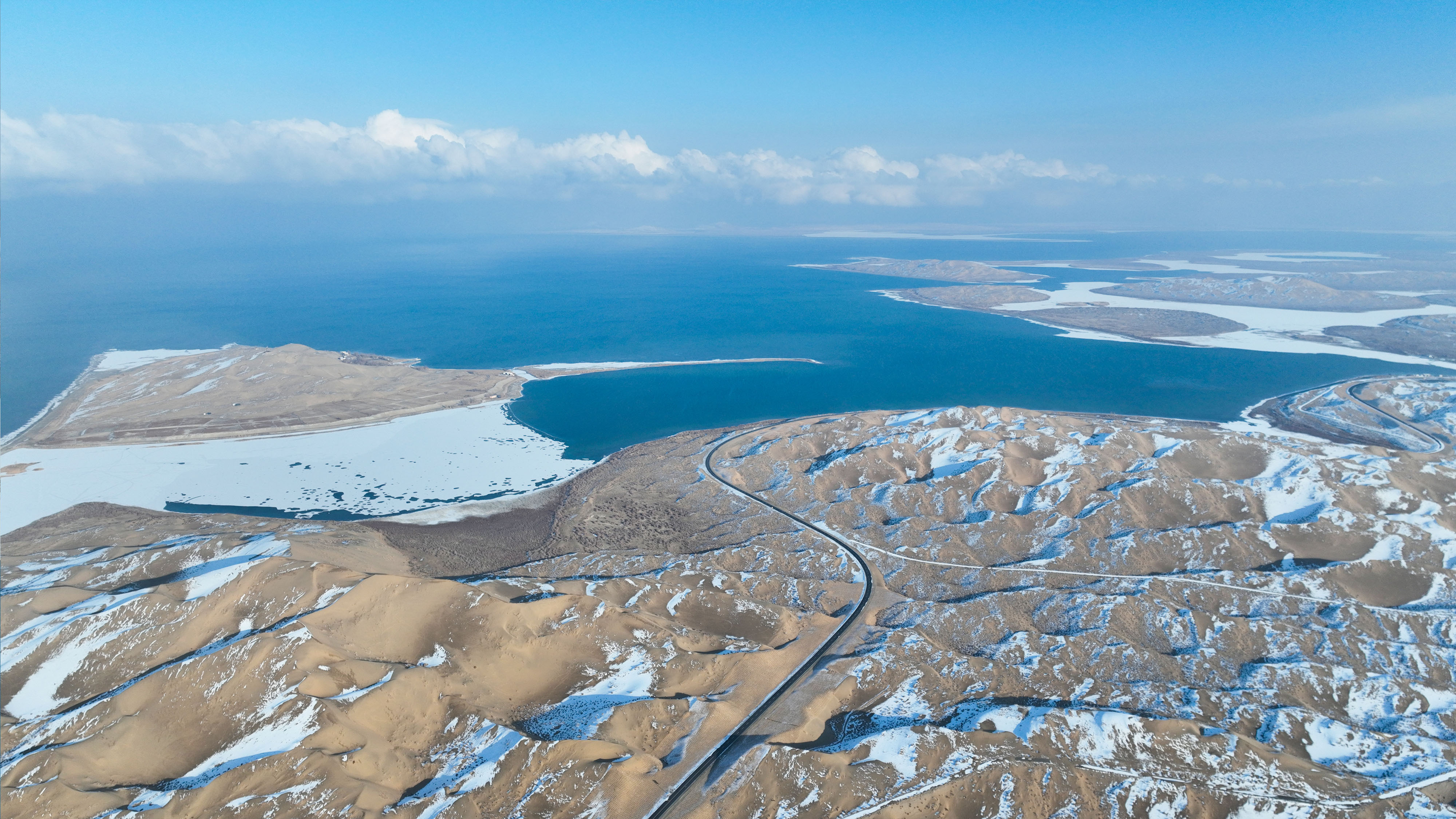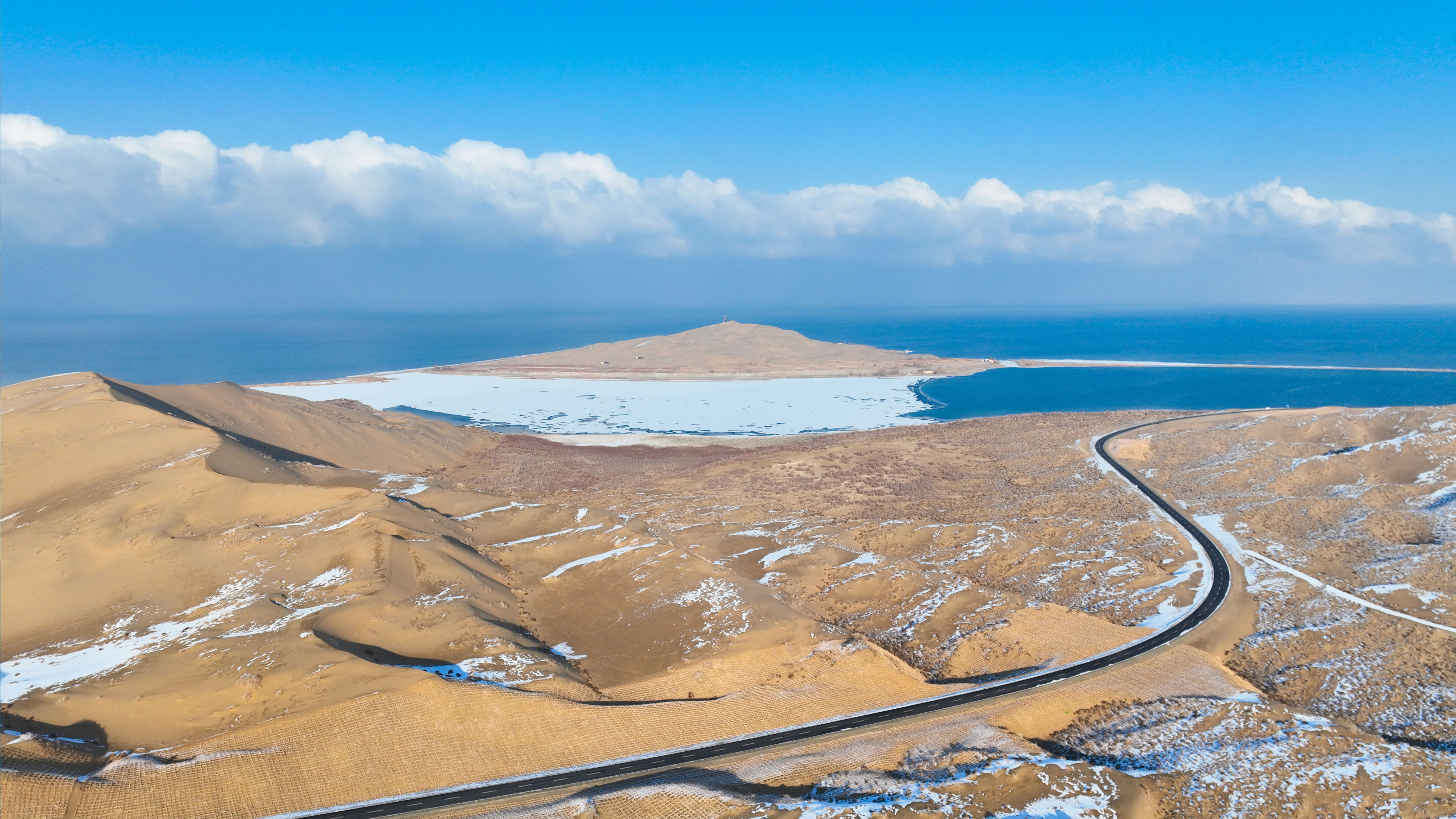 12月11日,雪后初晴,新疆博斯腾湖南岸的沙漠阳光洒落,雪覆沙丘闪耀着耀眼的光芒,天空、湖泊以及沙漠公路共同绘就了一幅冬日的壮丽画卷。