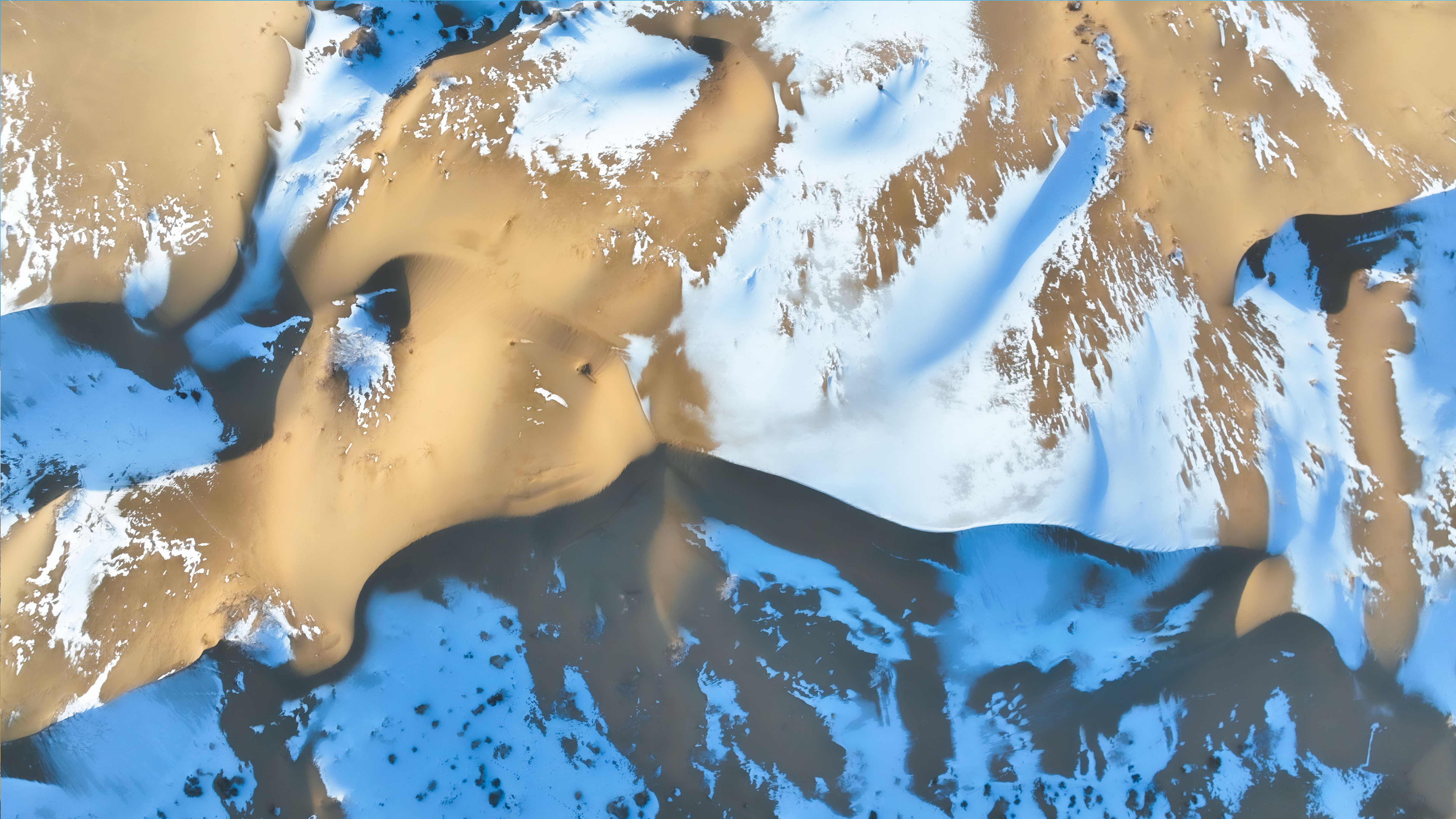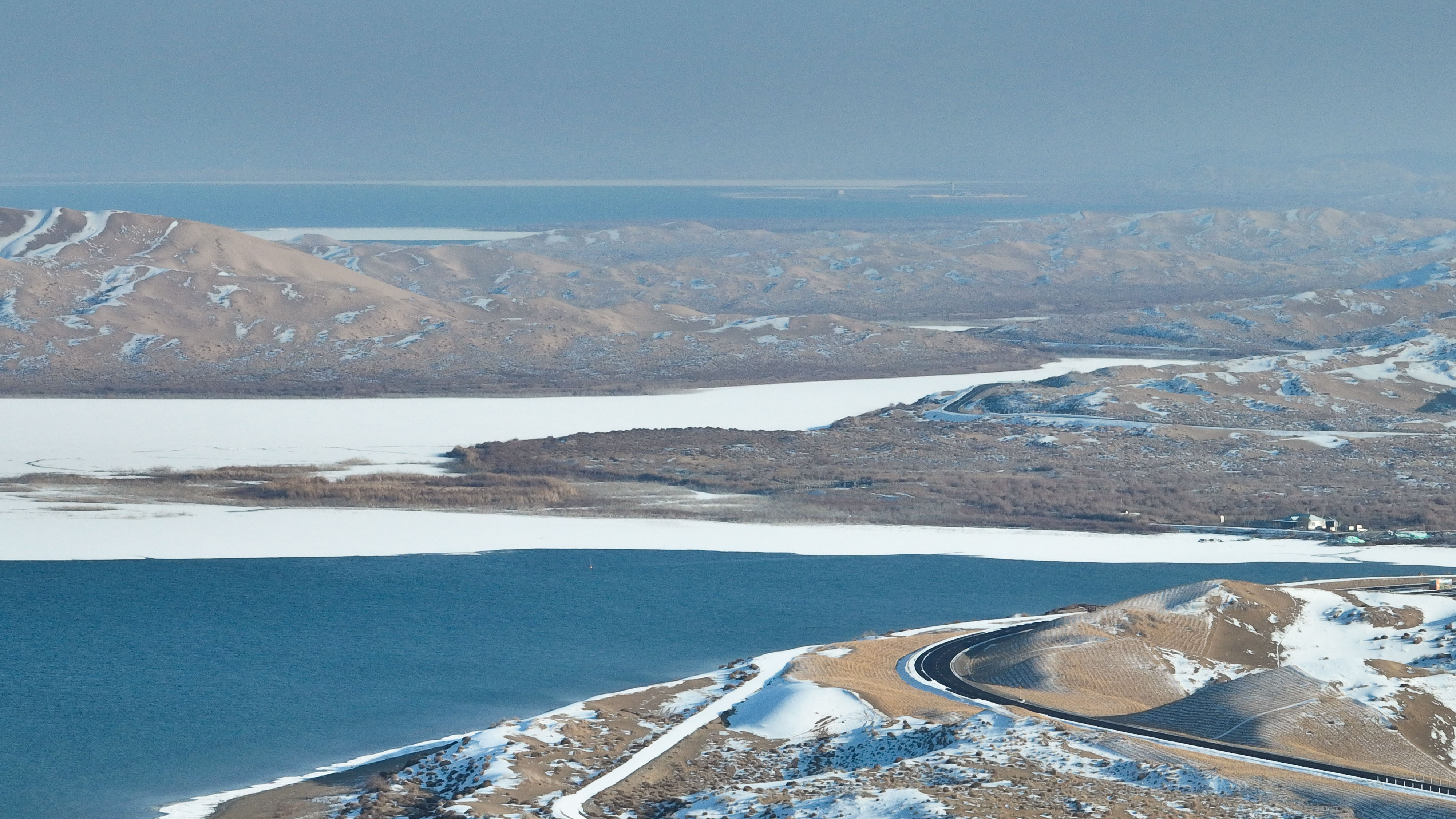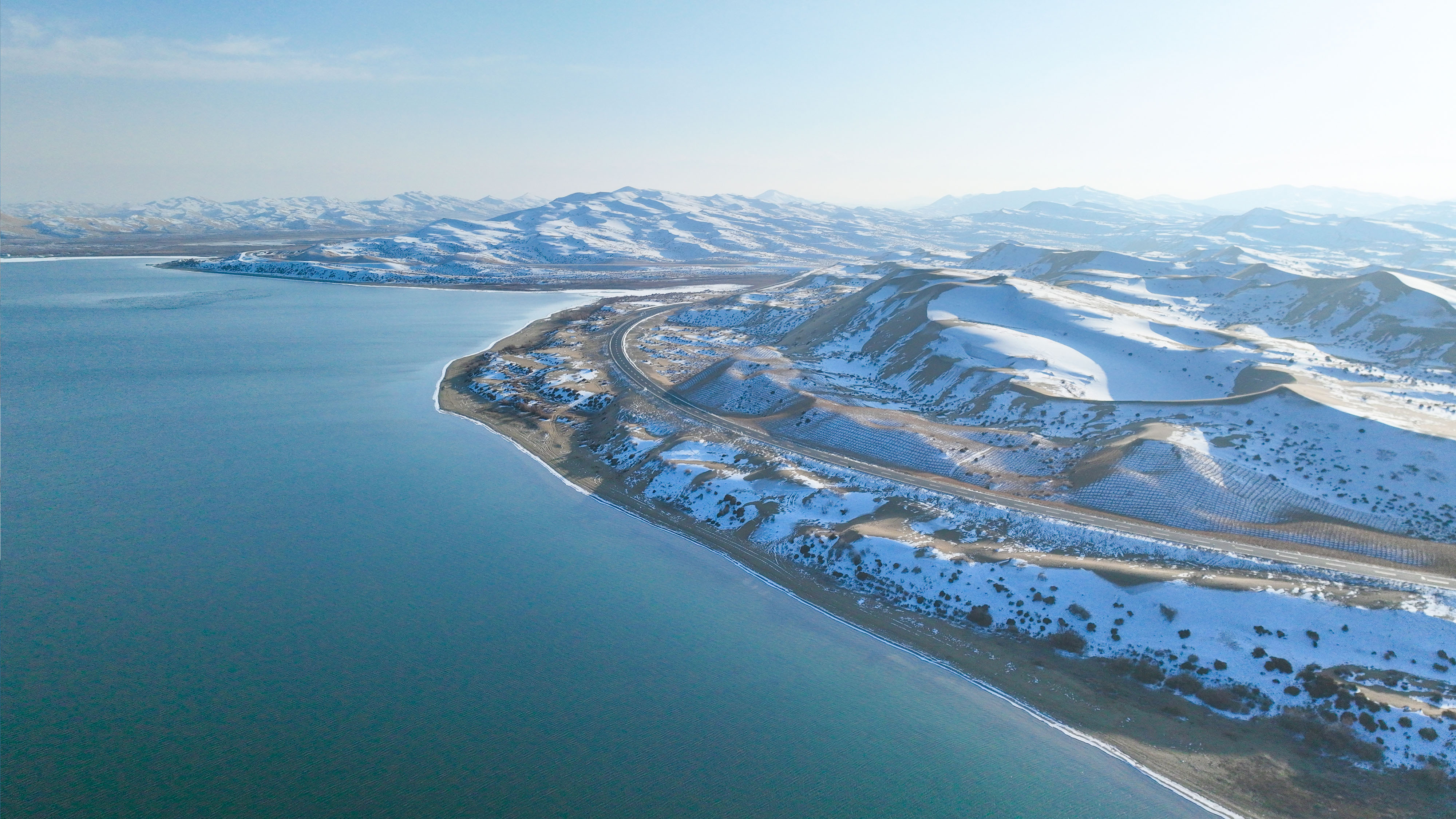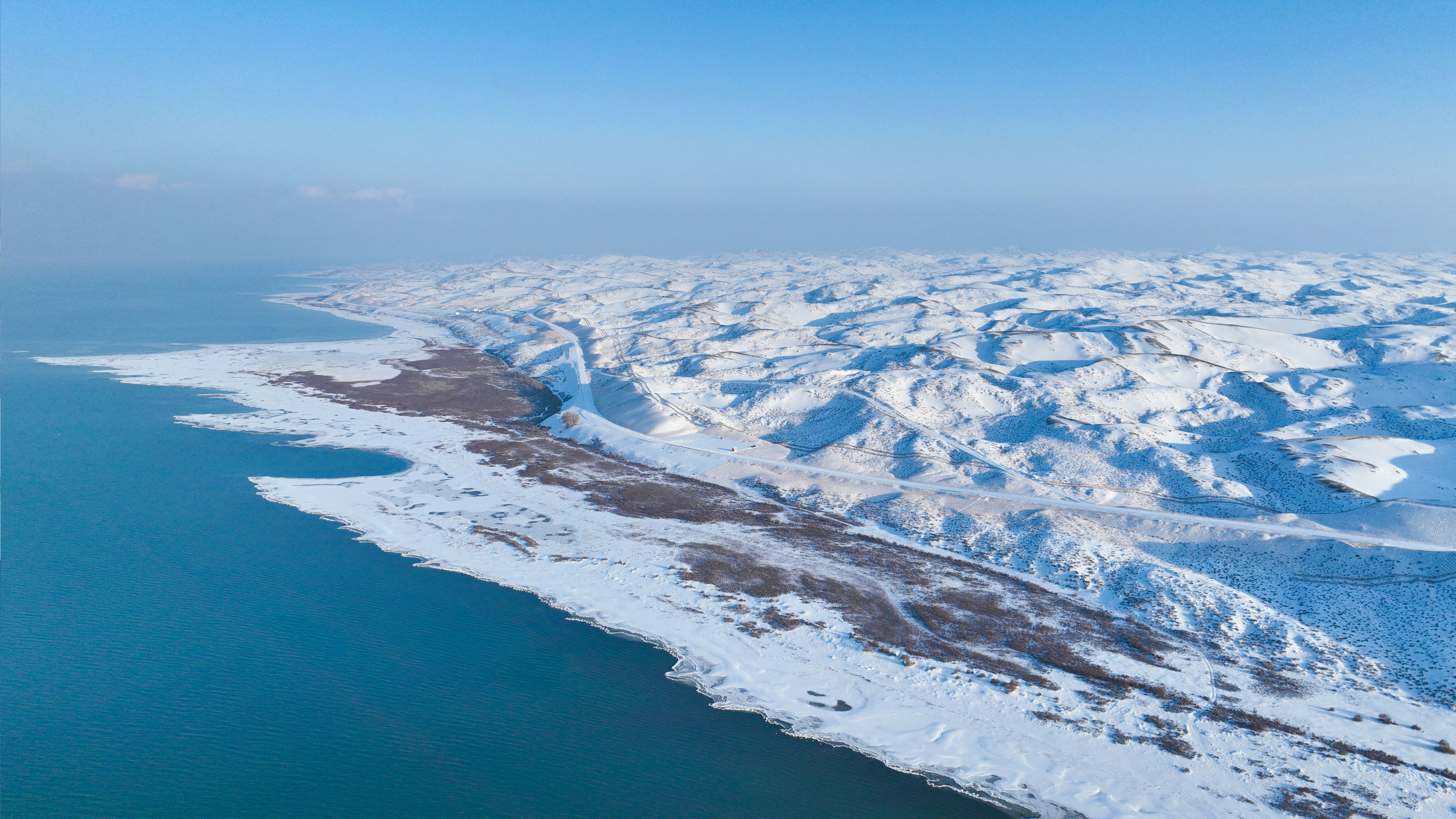 12月11日,雪后初晴,新疆博斯腾湖南岸的沙漠阳光洒落,雪覆沙丘闪耀着耀眼的光芒,天空、湖泊以及沙漠公路共同绘就了一幅冬日的壮丽画卷。