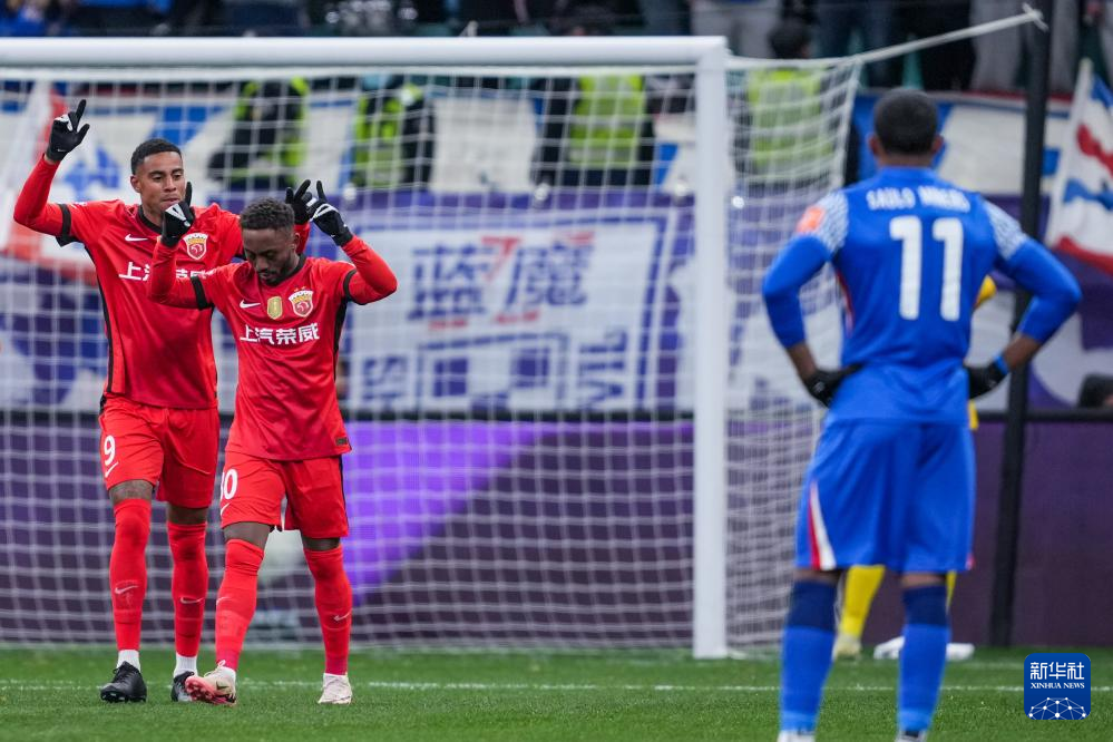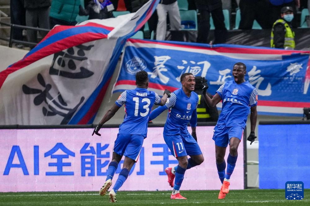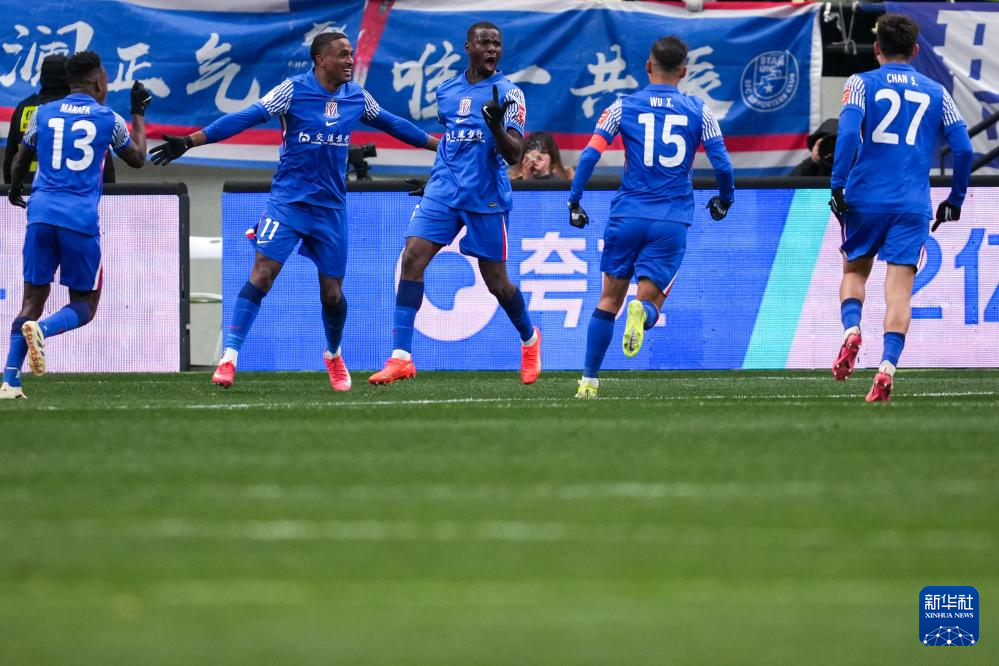 2月7日,上海申花队球员阿马杜(右一)与队友庆祝进球。
