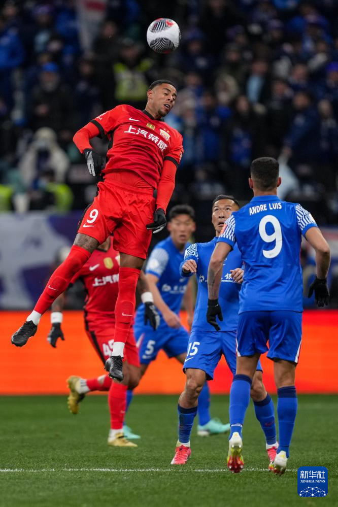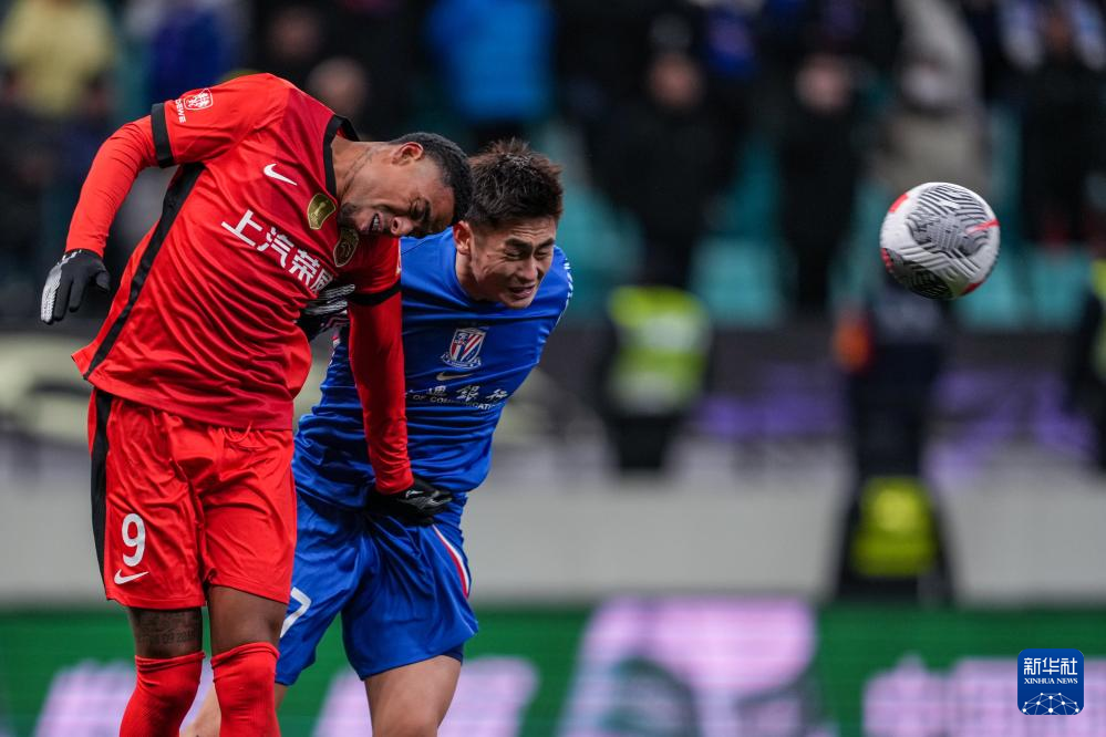 2月7日,上海海港队球员古斯塔沃(左一)在比赛中争抢头球。