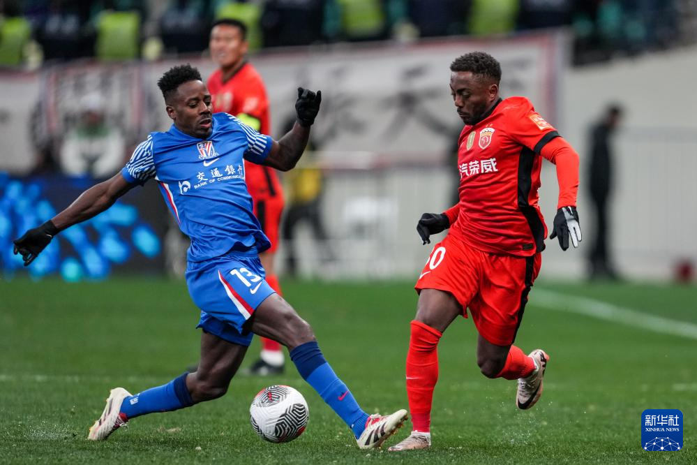 2月7日,上海海港队球员加布里埃尔(右)与上海申花队球员马纳法拼抢。