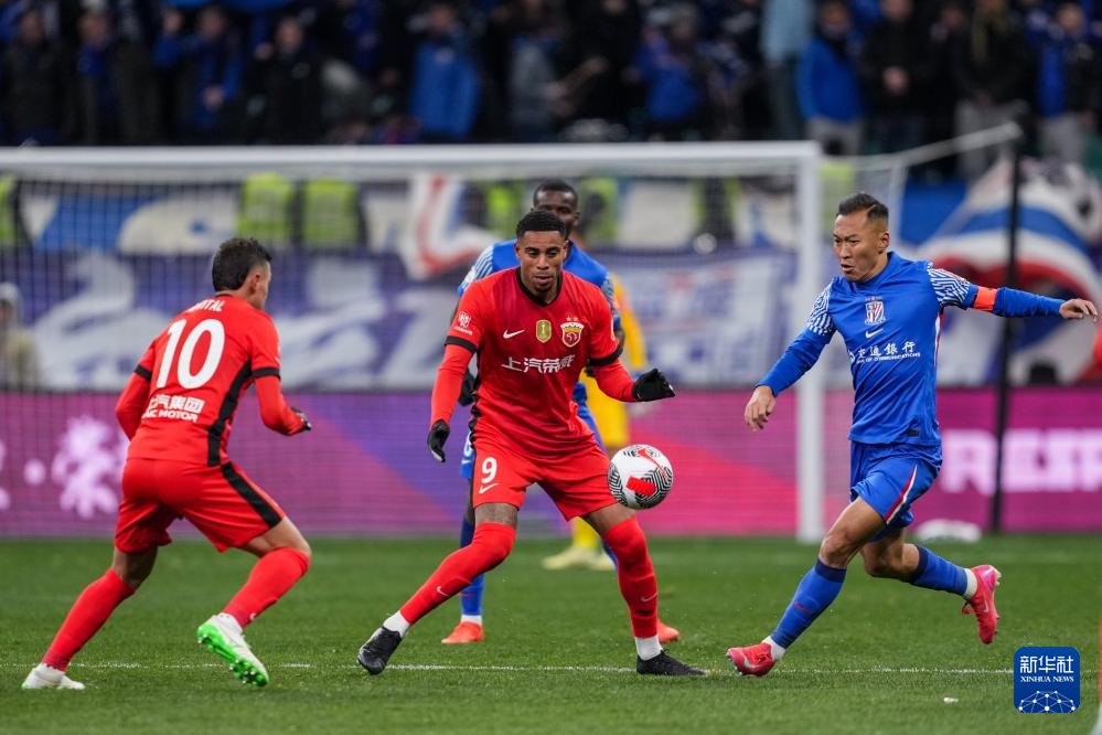 2月7日,上海申花队球员吴曦(右一)与上海海港队球员马特乌斯·维塔尔(左一)、古斯塔沃(中)在比赛中拼抢。