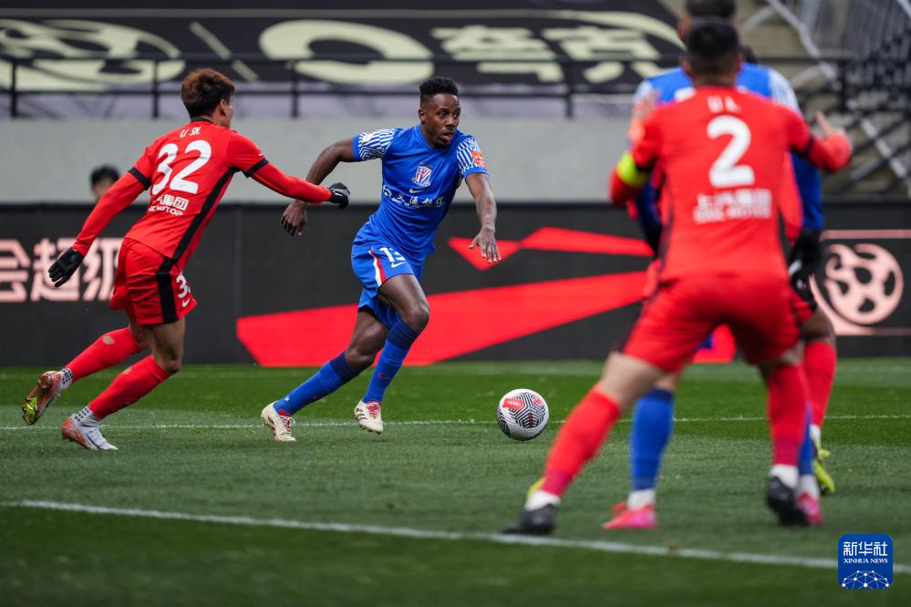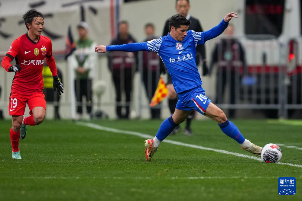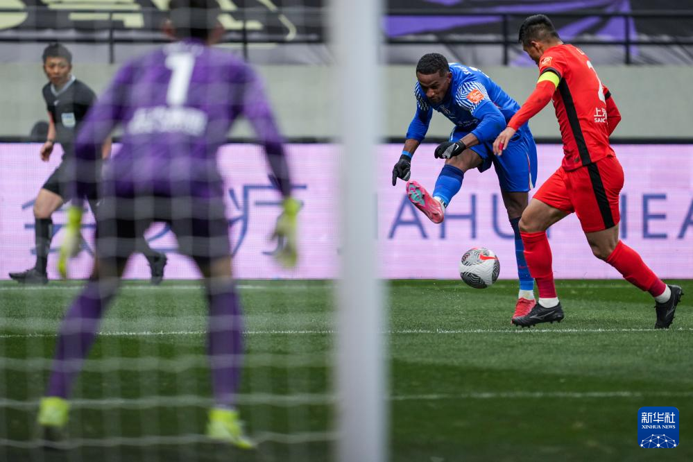 2月7日,上海申花队球员绍洛·米内罗(右二)在比赛中射门。