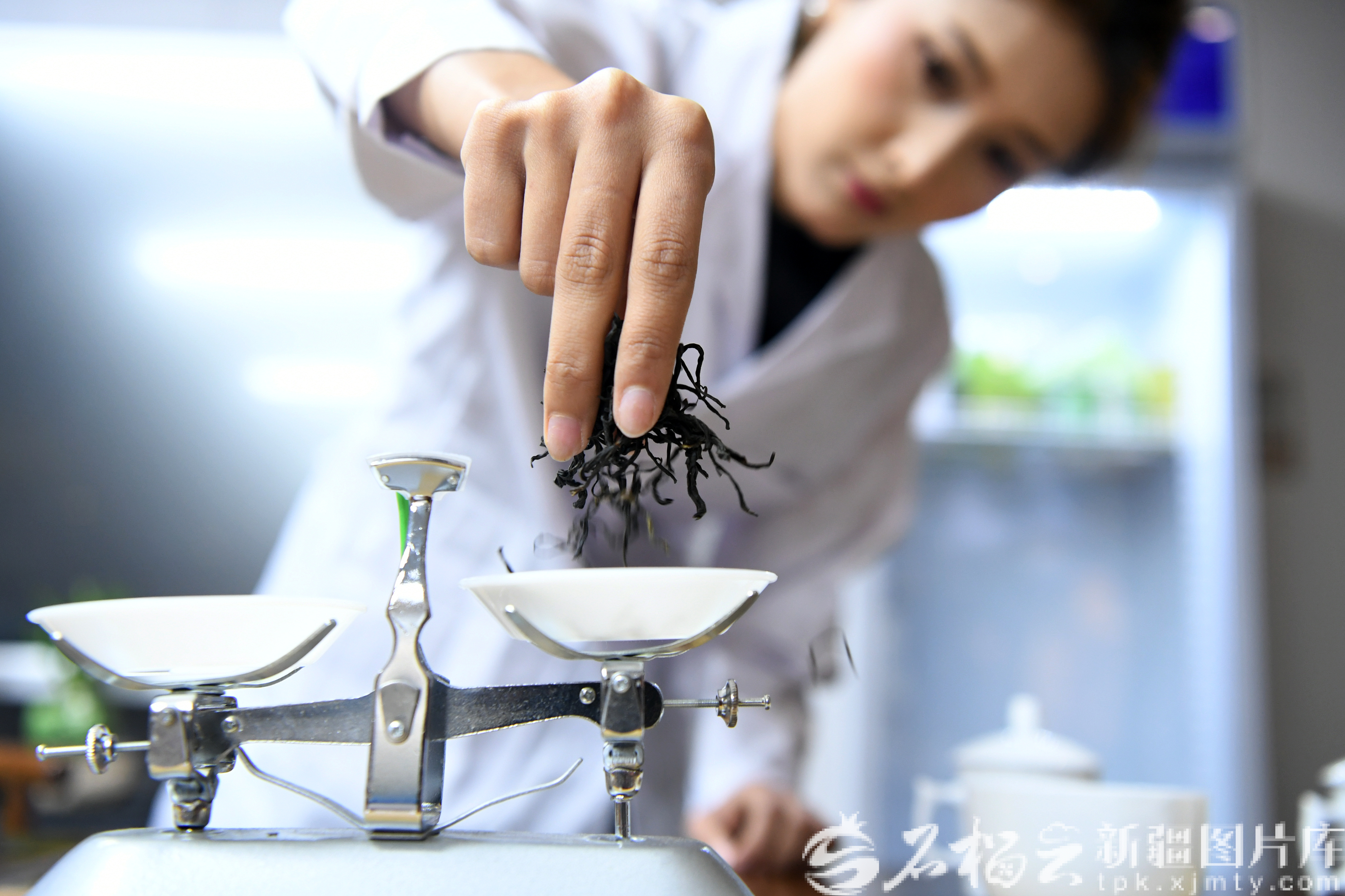 11月30日,夏黑班木在审评茶叶,先对茶叶称重。