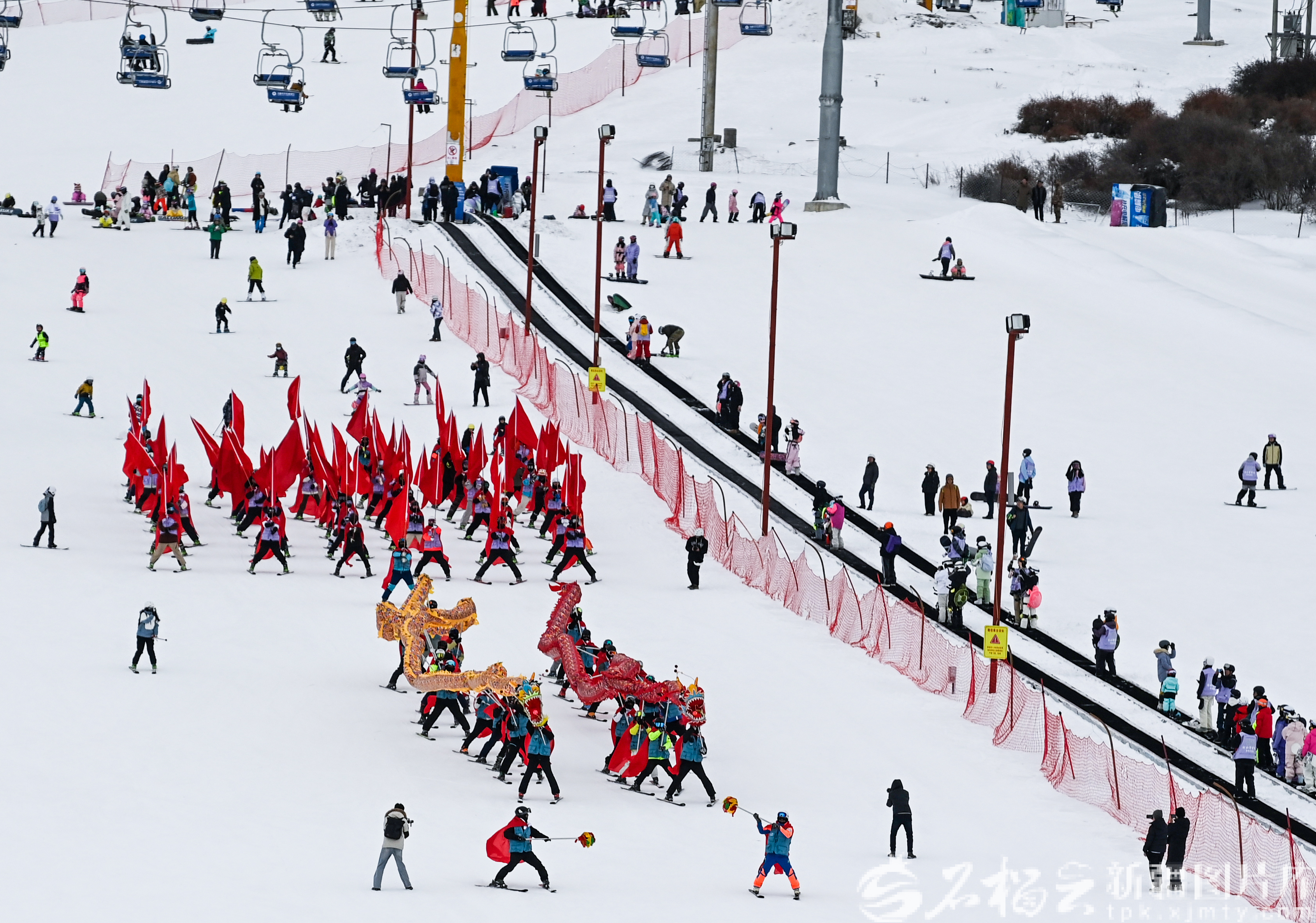 12月21日,滑雪爱好者在位于乌鲁木齐县的白云国际滑雪场滑雪舞龙。