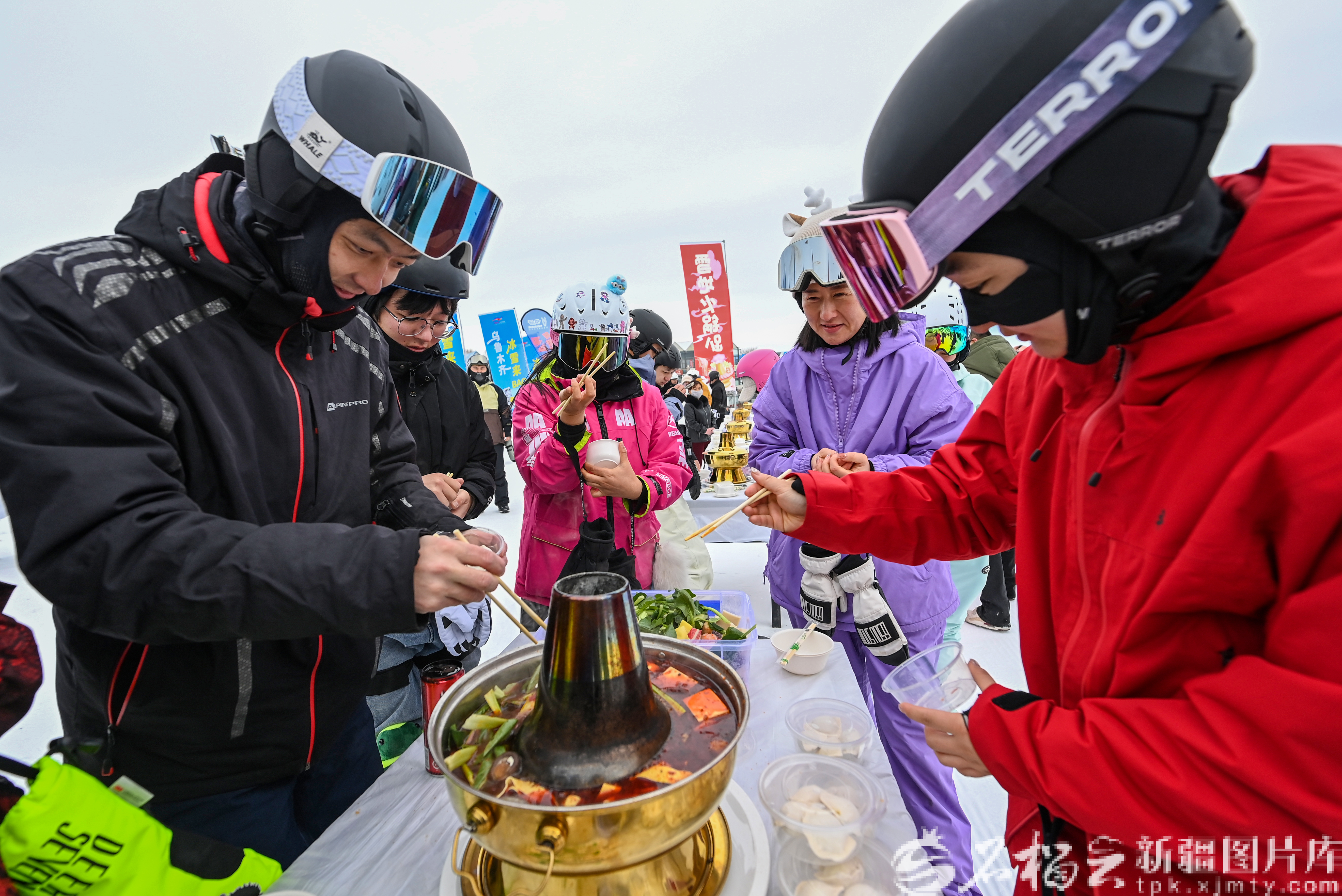 12月21日,在位于乌鲁木齐县的白云国际滑雪场,游客在露天吃火锅。