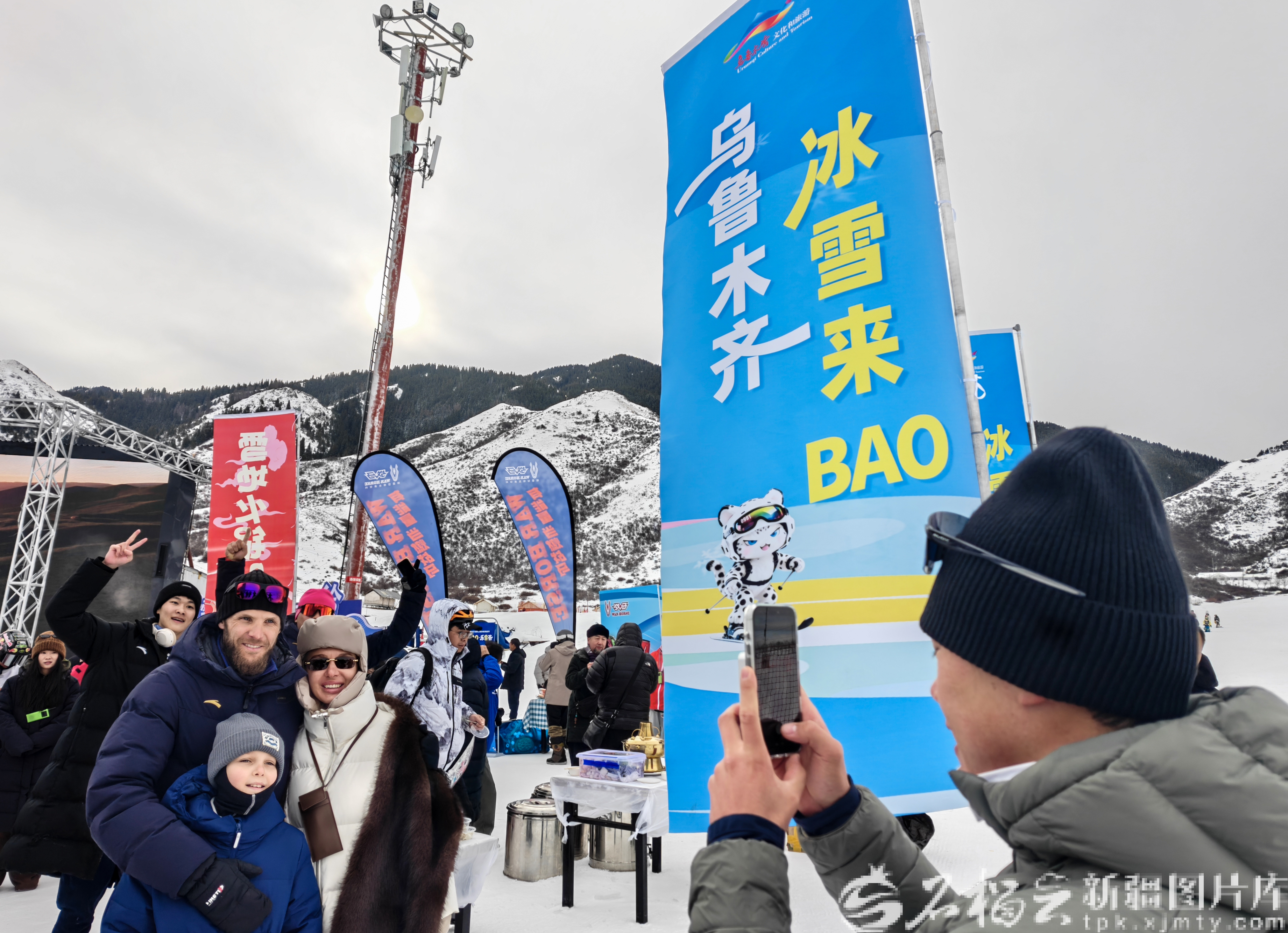 12月21日,外国游客在位于乌鲁木齐县的白云国际滑雪场合影留念。