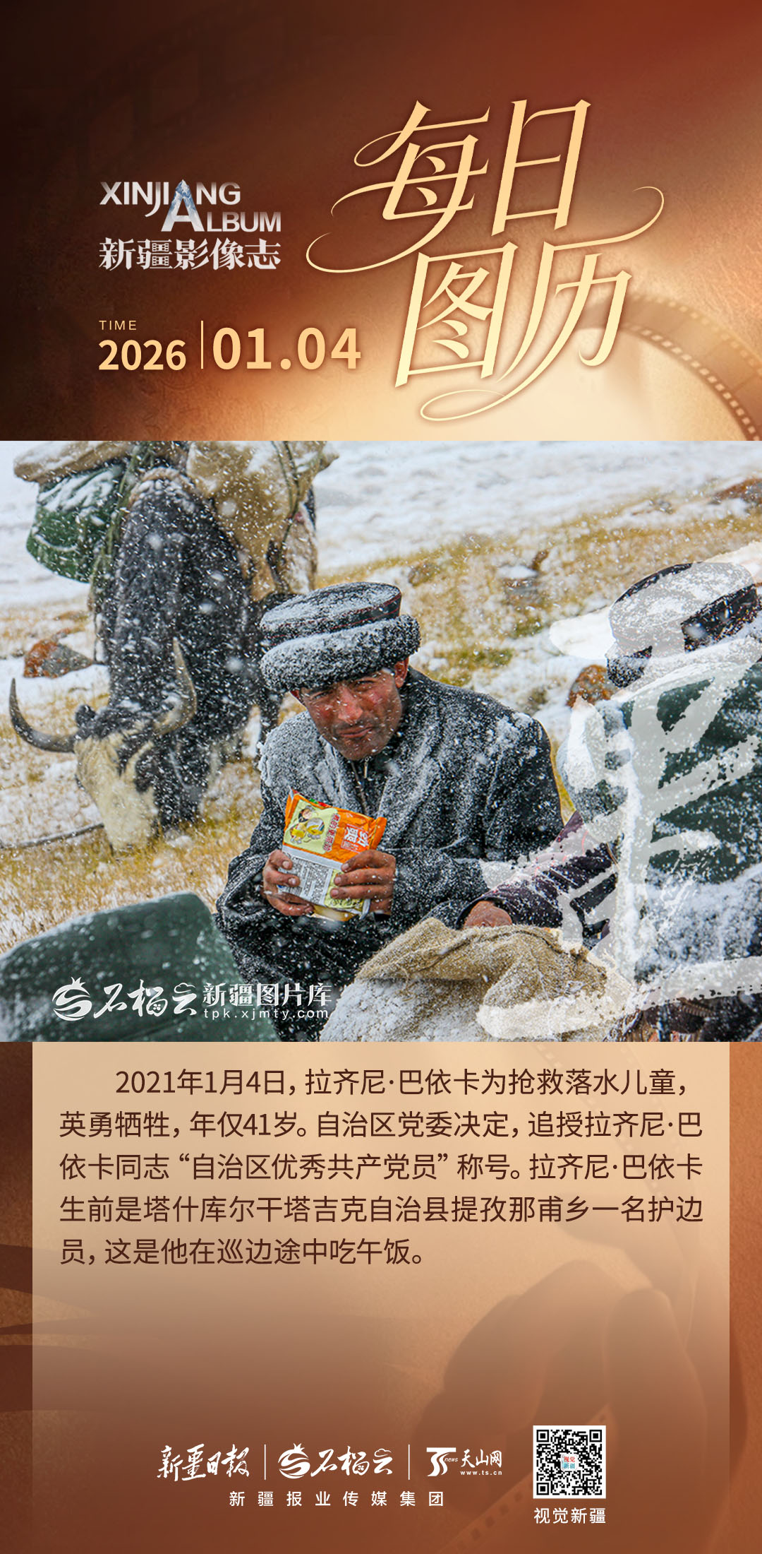 2021年1月4日,拉齐尼·巴依卡为抢救落水儿童,英勇牺牲,年仅41岁。自治区党委决定,追授拉齐尼·巴依卡同志“自治区优秀共产党员”称号。拉齐尼·巴依卡生前是塔什库尔干塔吉克自治县提孜那甫乡一名护边员,这是他在巡边途中吃午饭。