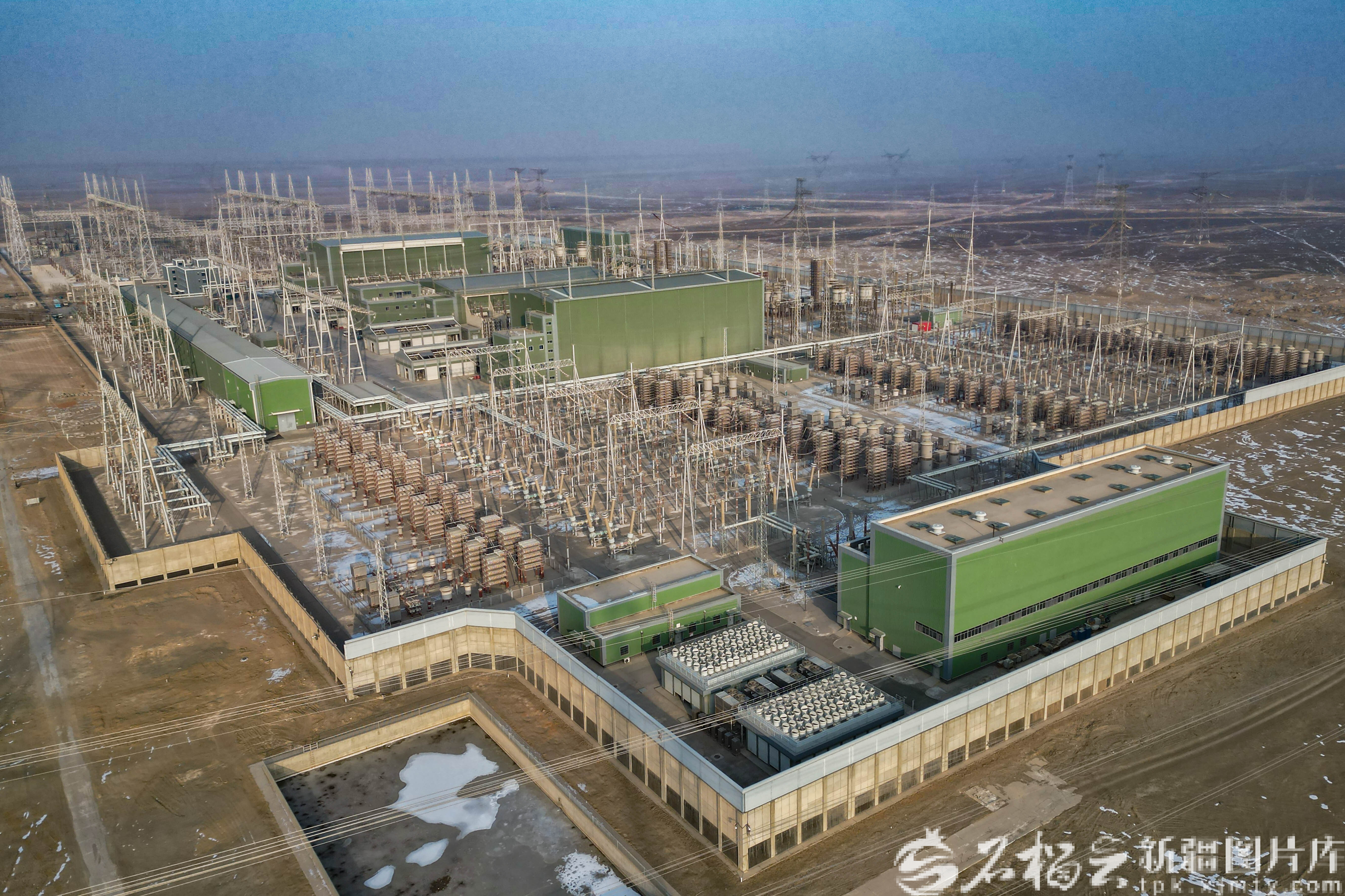 1月12日,在哈密市伊州区南部拍摄的哈密南-郑州±800千伏特高压直流输电工程天山换流站一角。