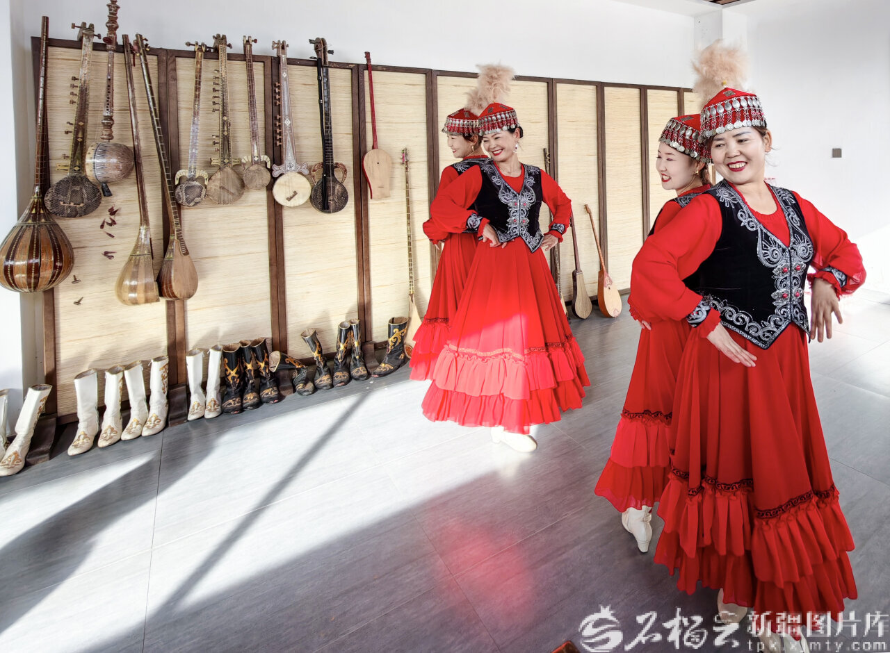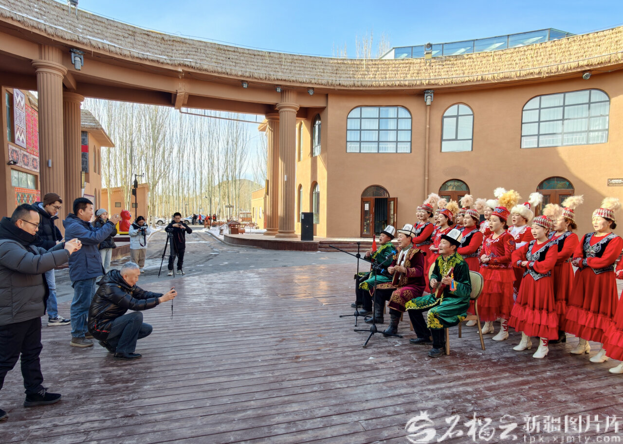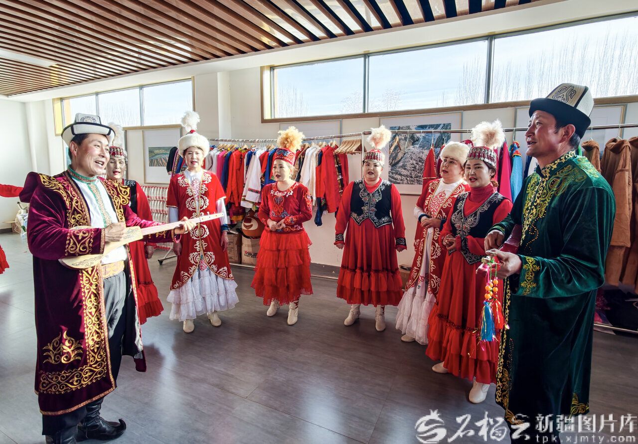 1月15日,温宿县博孜墩柯尔克孜族乡阿克布拉克村游客服务中心,民间艺人在排练节目。