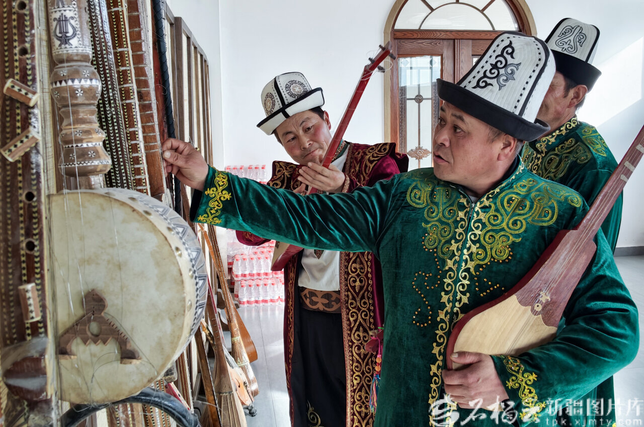 1月15日,温宿县博孜墩柯尔克孜族乡阿克布拉克村游客服务中心,民间艺人在演出前选择乐器。