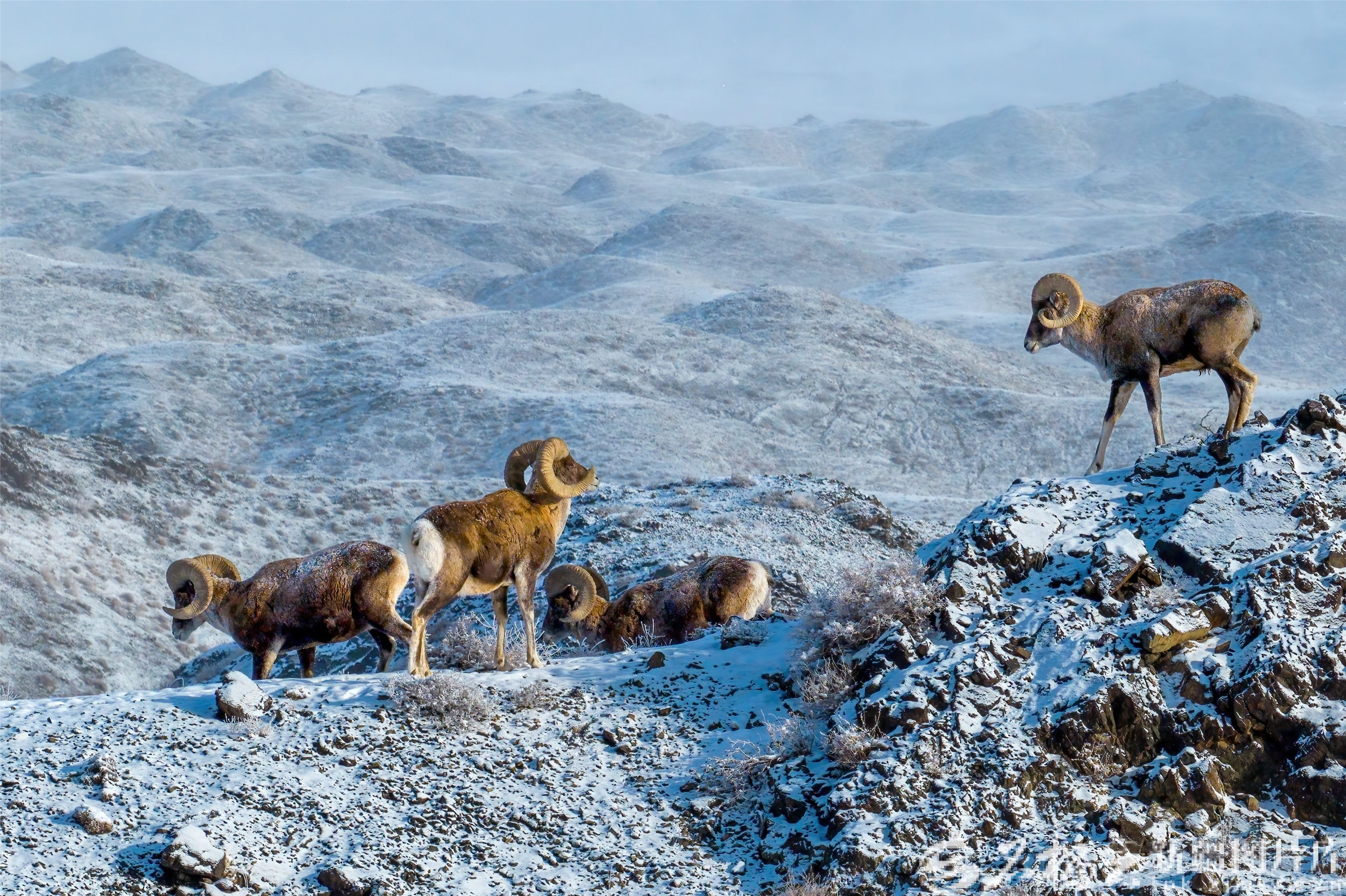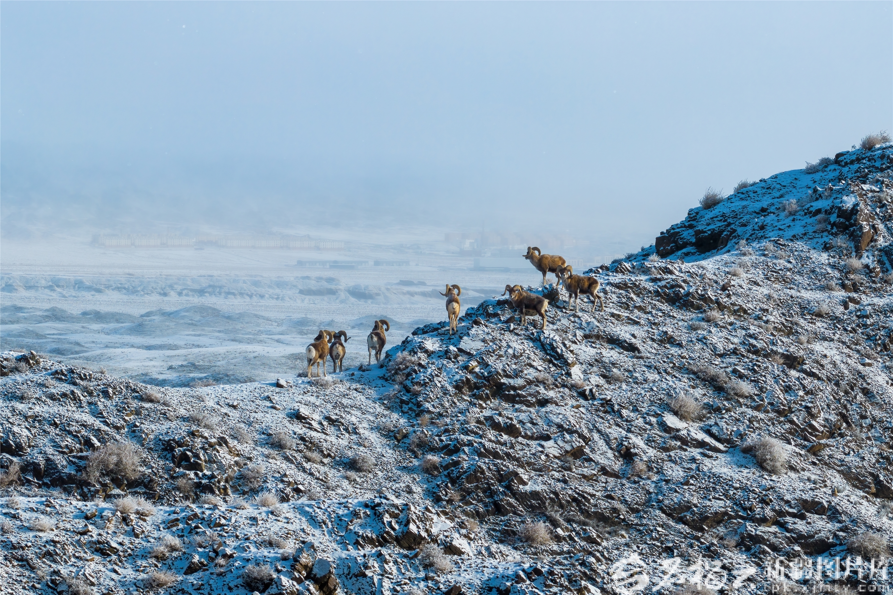 1月17日,克拉玛依市区北郊,国家二级保护野生动物盘羊漫步在银装素裹的山野间。
