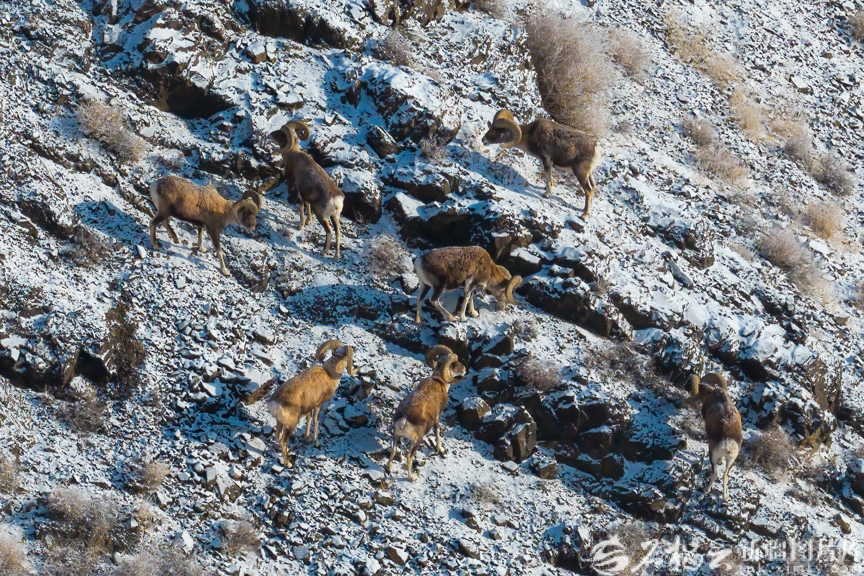1月17日,克拉玛依市区北郊,国家二级保护野生动物盘羊漫步在银装素裹的山野间,或踏雪觅食,或驻足观望。