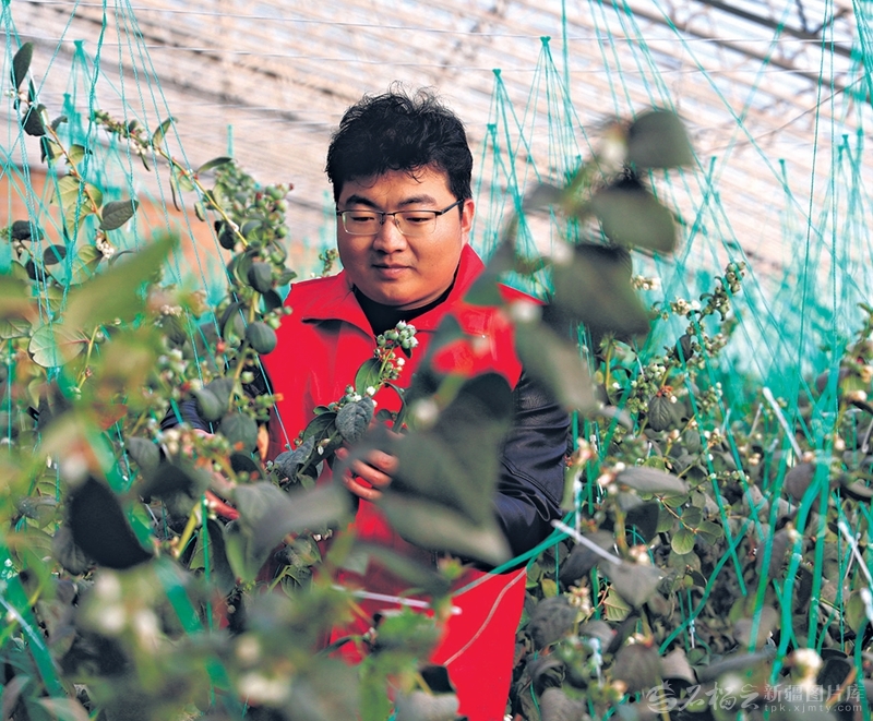 1月20日,志愿者在库车市乌恰镇乌恰三村温室大棚帮助村民管护蓝莓。目前,该村种植的蓝莓开始挂果。□刘鼎摄