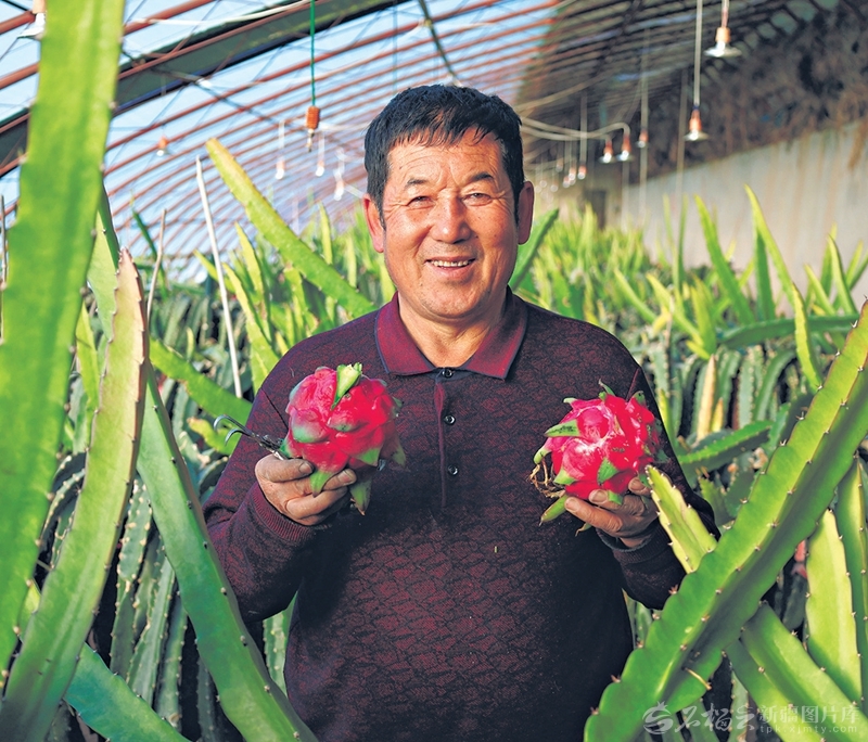 1月20日,吉木萨尔县大有镇火龙果种植基地员工在展示火龙果。近年来,该镇因地制宜引进高附加值经济作物,推动农业增效、农民增收。□马凯雄摄