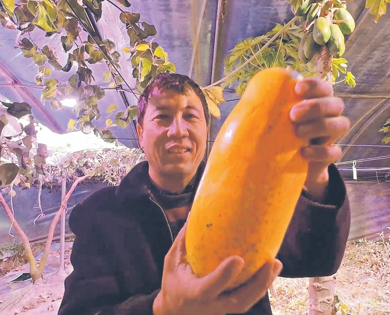 1月18日,村民展示种植的木瓜。墨玉县加汗巴格乡阿依玛克村现有智能温室大棚122座,种植香蕉、木瓜、青枣等水果。□刘绍斌摄