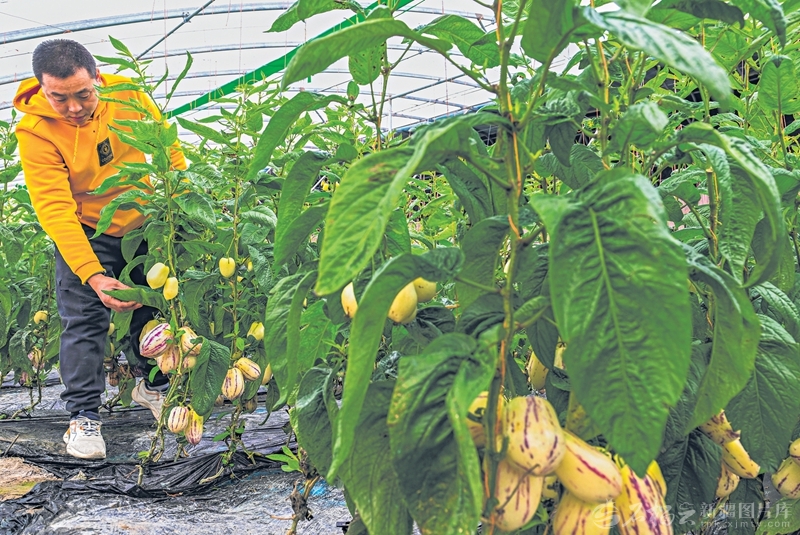 1月20日,种植户在管护人参果。眼下,库尔勒市英下乡其兰巴格村现代设施产业园种植的人参果进入盛果期,预计2月中旬上市销售。□韩峻摄