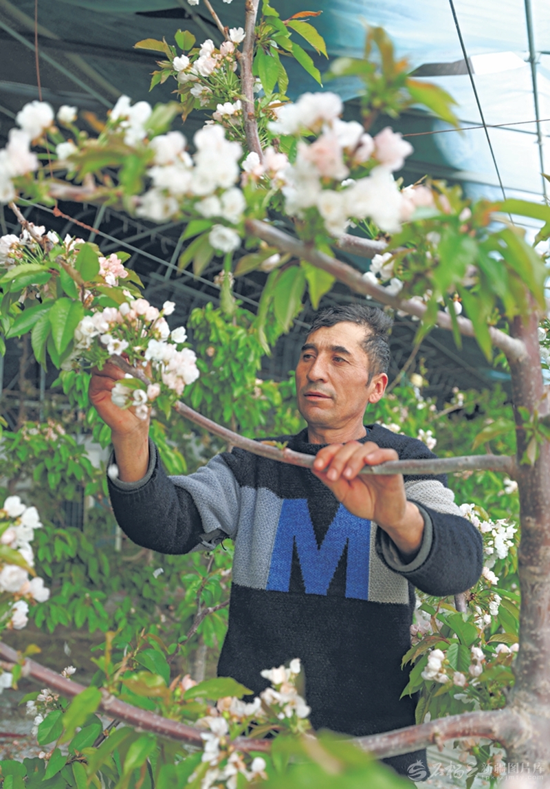 1月21日,塔什库尔干塔吉克自治县提孜那甫乡的90座温室大棚内,一派春意盎然的景象。粉白色的车厘子花缀满枝头,清香弥漫,工人正忙着疏花,提高坐果率。□那孜米克·托合提巴依摄
