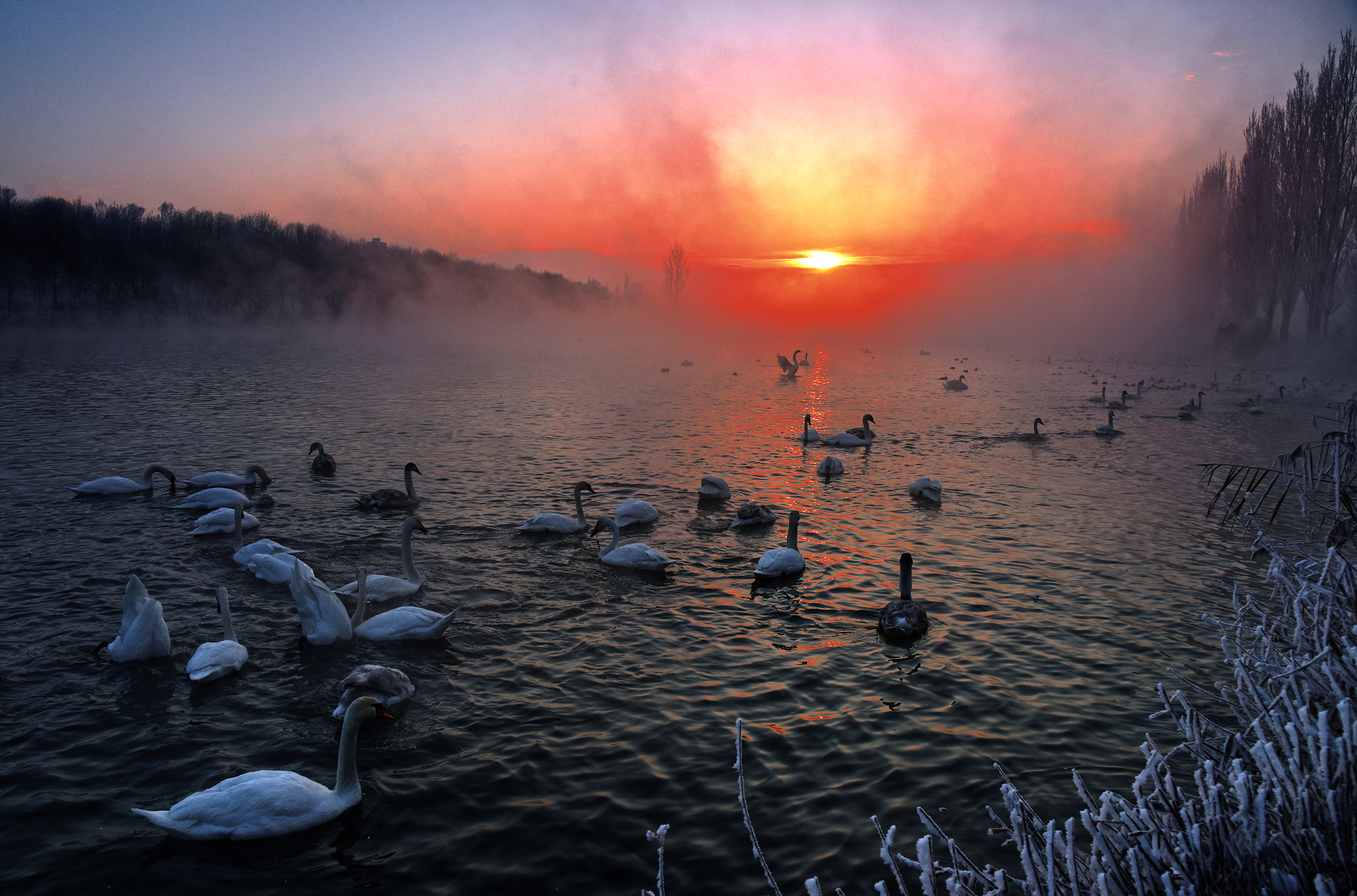 大寒以来,伊宁县天鹅泉连续多日雾凇凝霜、雾气氤氲,远山皑皑白雪映着金色朝霞,成群疣鼻天鹅、大天鹅翩跹起舞,构成一幅梦幻般的冬日画卷。
