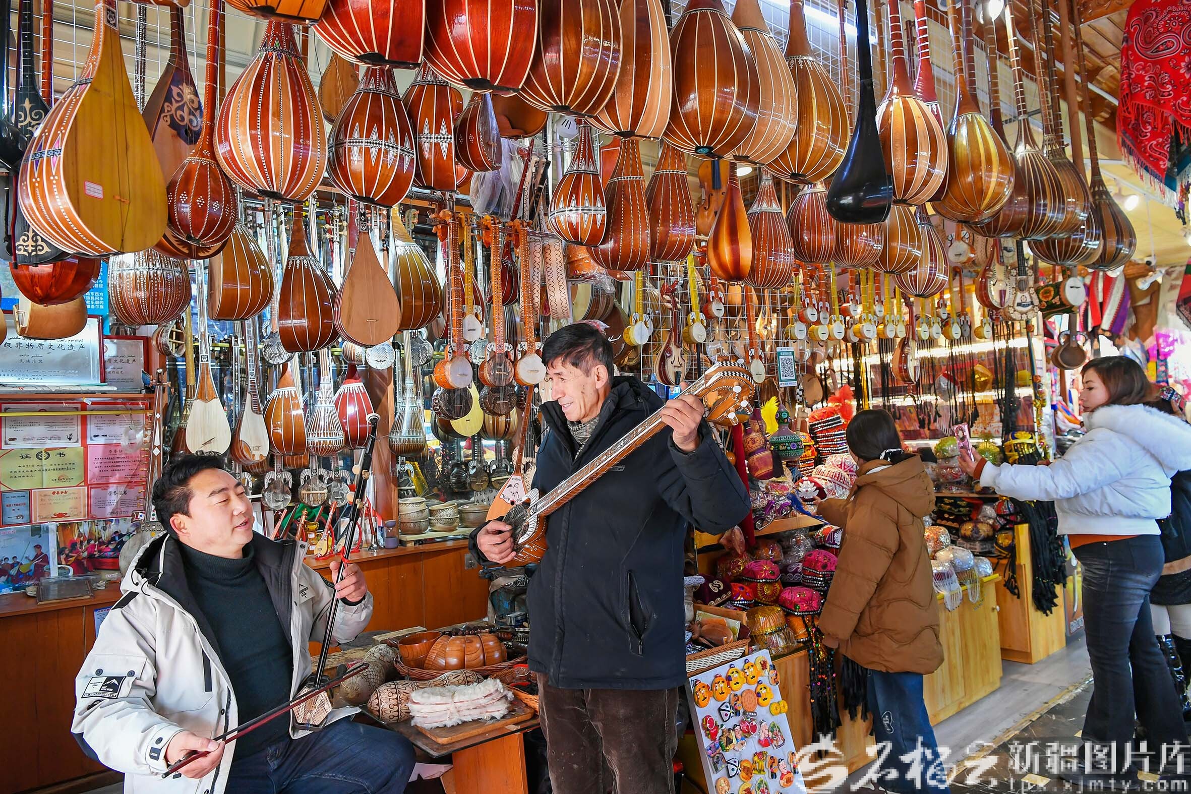 1月21日,在位于新疆国际大巴扎景区的乐器店里,来自贵州的乐器爱好者(左一)与艾尔肯·吐么尔切磋技艺。