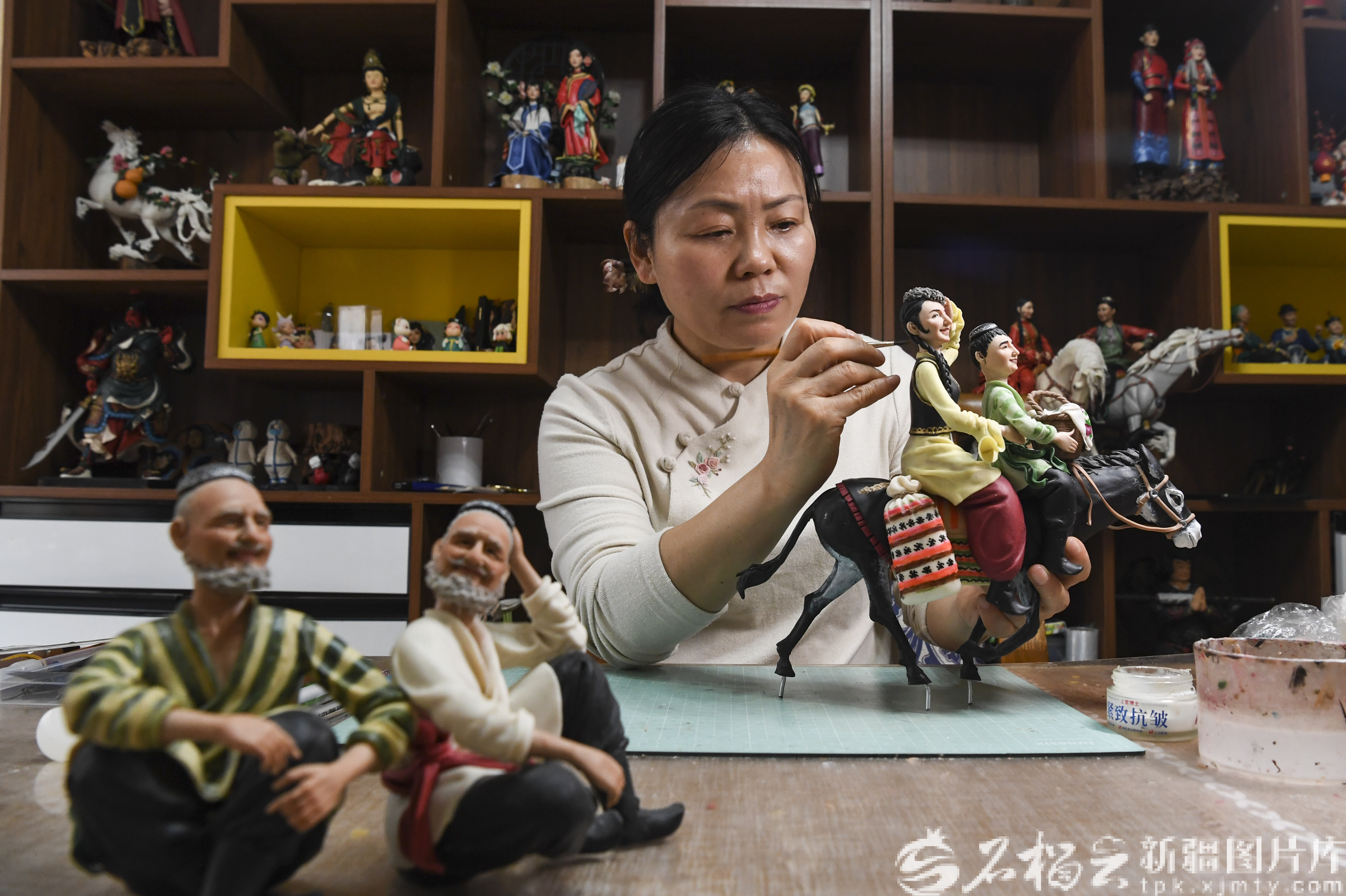 1月14日,新疆生产建设兵团工艺美术大师、博乐市非物质文化遗产面塑项目代表性传承人王帆给面塑作品上彩。她的作品主题多聚焦于新疆各地的民俗风情,巧妙地将丰富多元的民族文化融入面塑艺术之中。石榴云/新疆日报记者 汤永摄